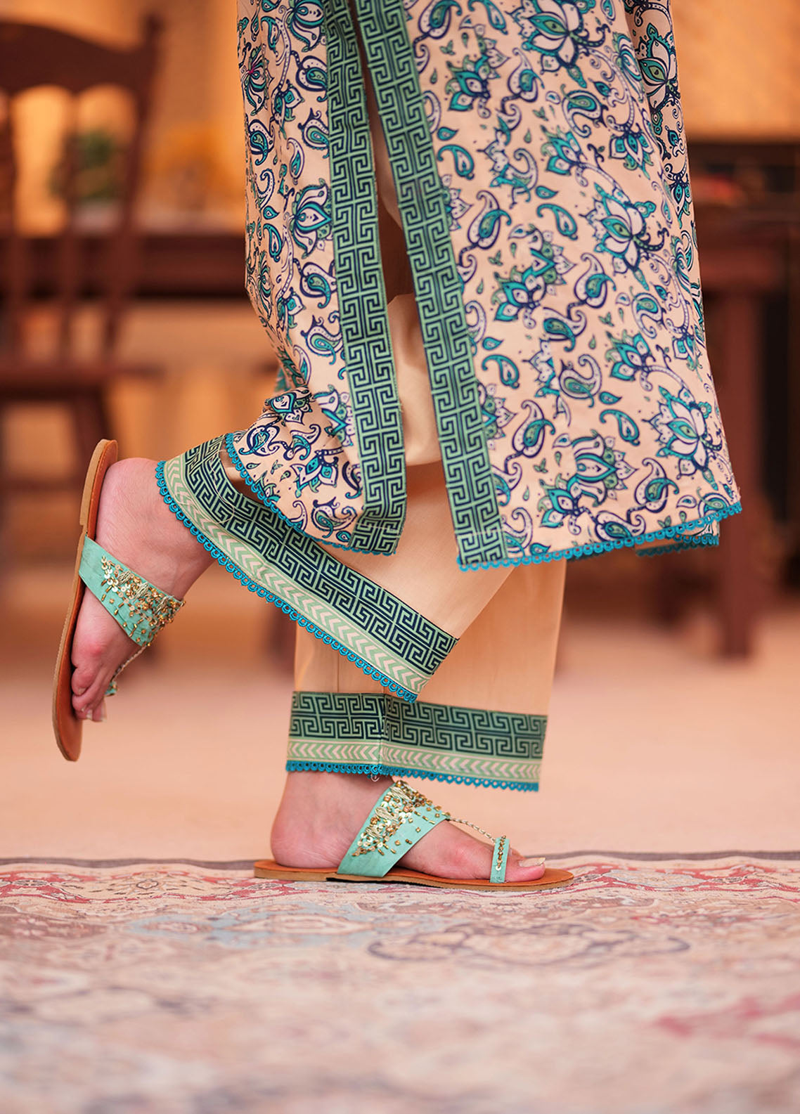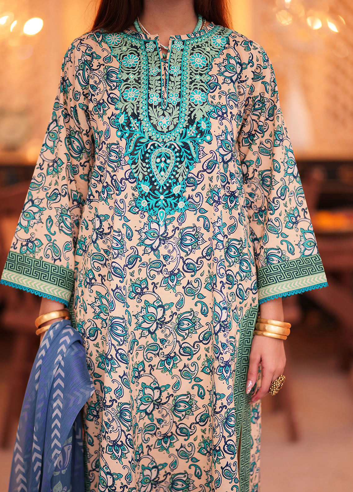 Aline shirt with heavy embroidered neckline Contrast printed border on sleeves and chalks Paired with Loose cut pants and chiffon printed dupatta