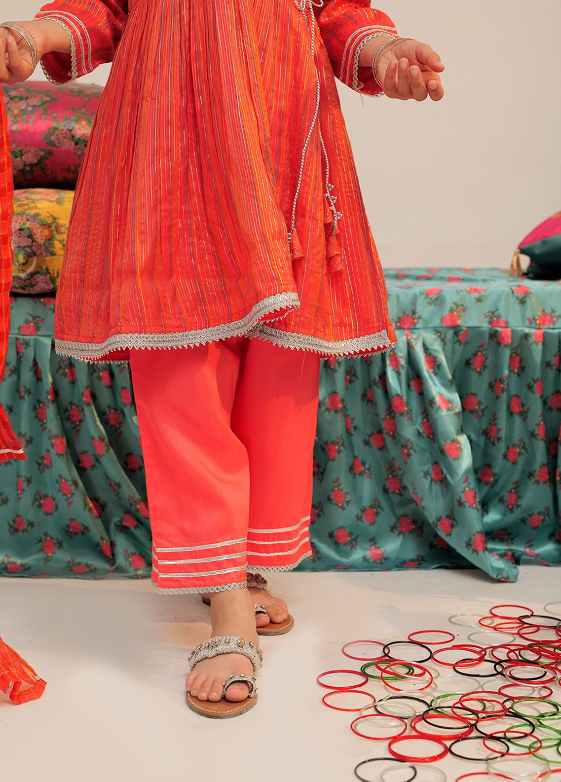 Angharka style frock with quarter sleeves Finished with fancy embroidery on front and sleeves along with lace and handmade dori Paired with straight pants and dupatta