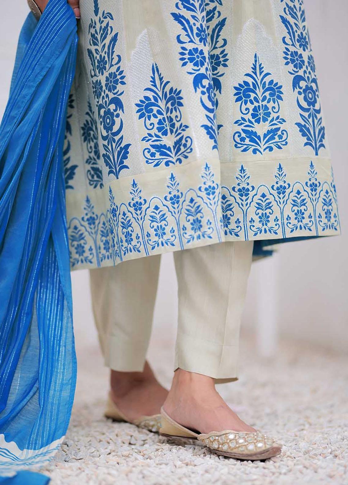 A line kali frock with stylish neckline embellished with loop buttons Paired with contrasting dupatta and cigarette pants