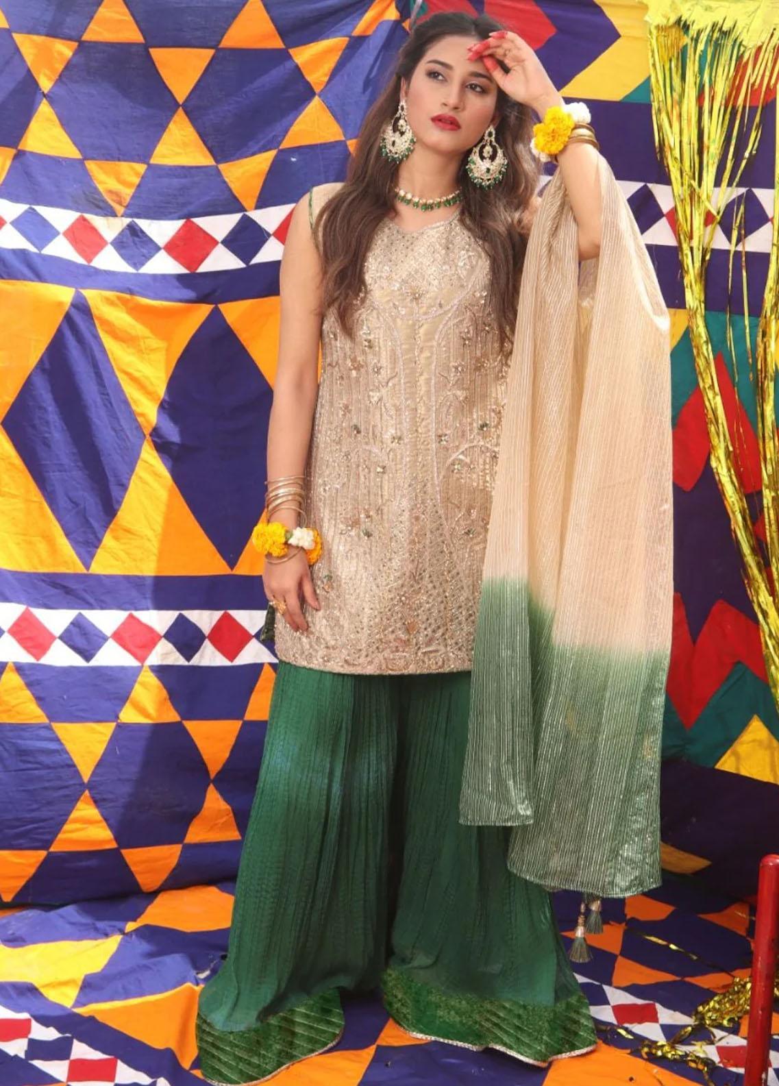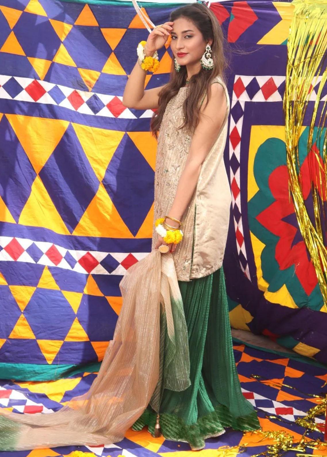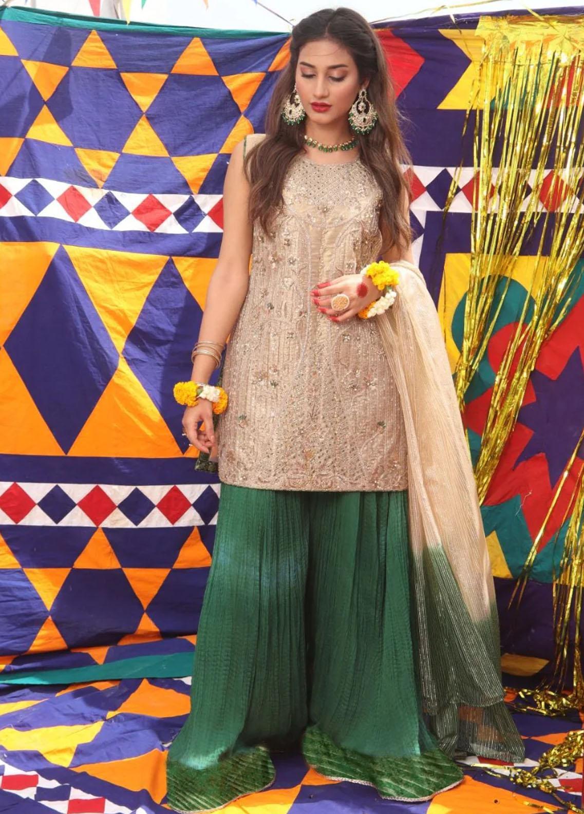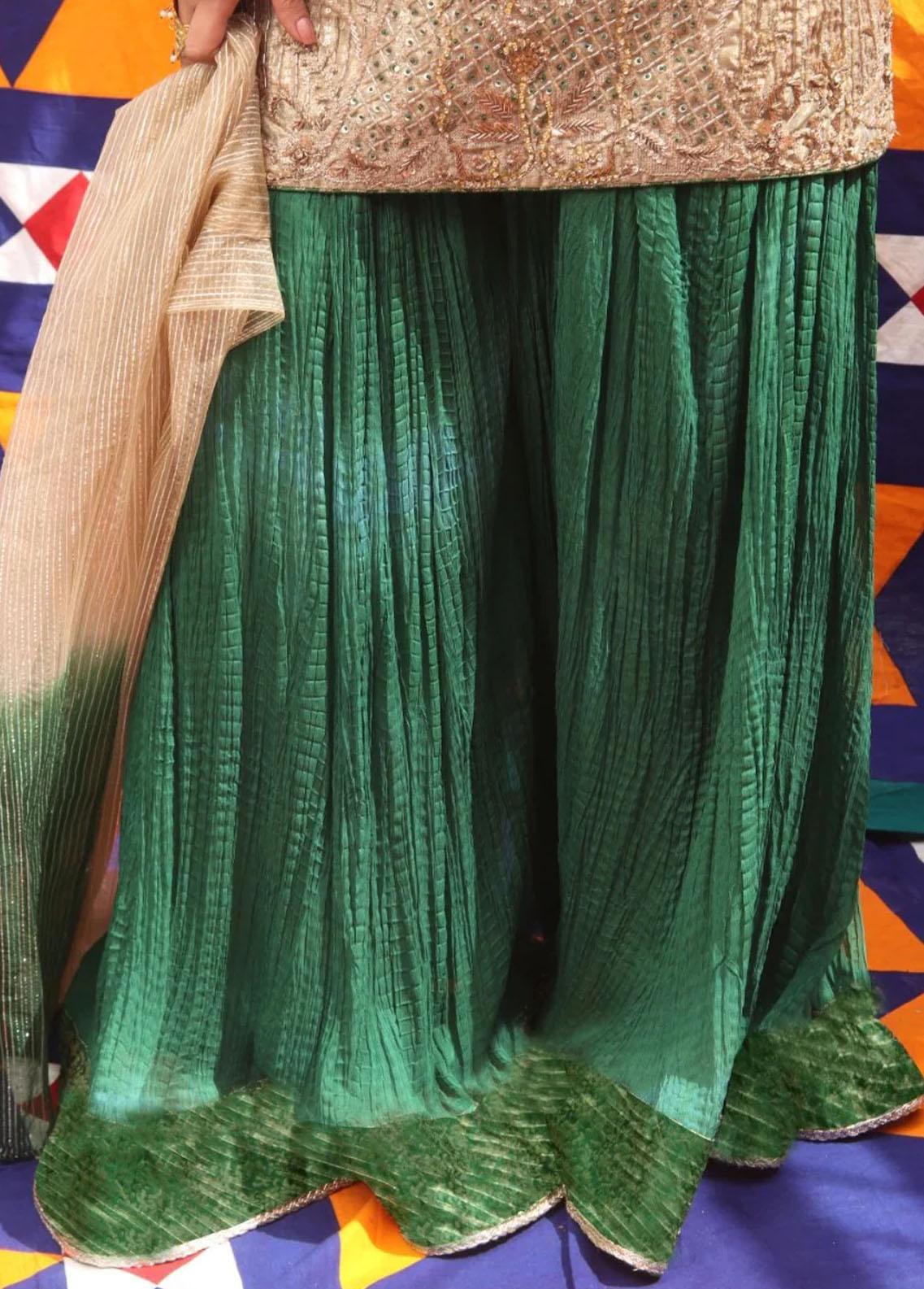 Straight shirt with heavy zardozi work on front Paired with crush fabric Lahenga and organza dupatta