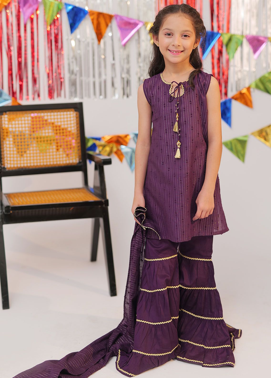 A line shirt with key hole neckline and open chalks Embellished with fancy lace and handmade fancy dori Paired with flared gharara pants and a fancy dupatta