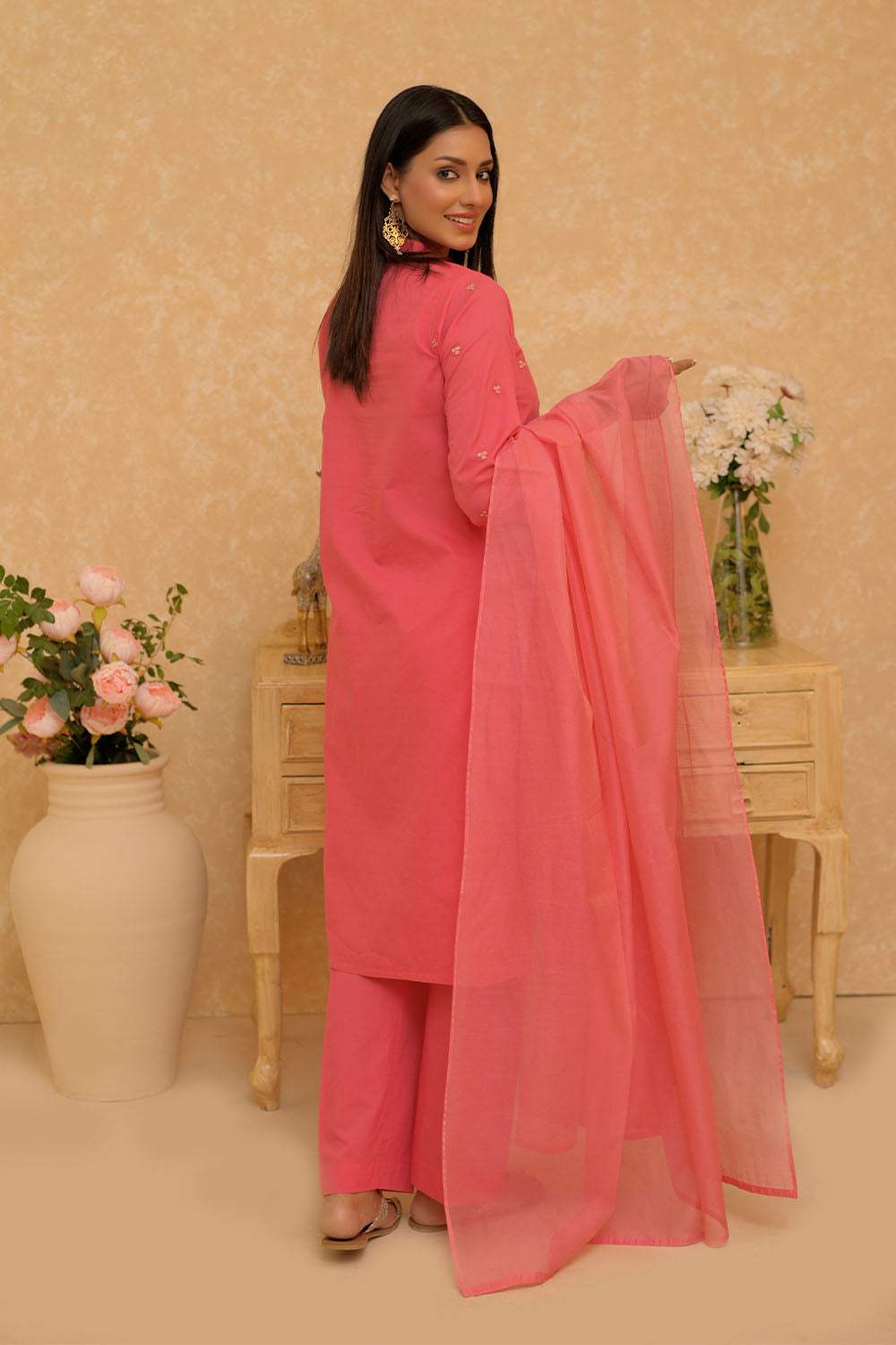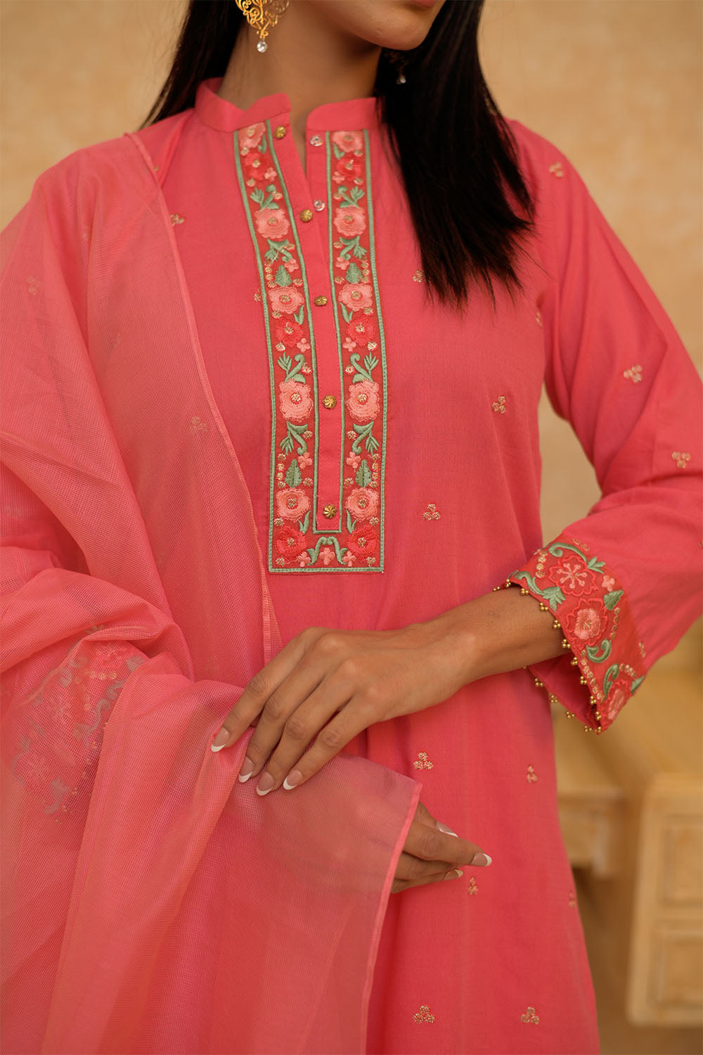 All over embroidered shirt with detailed embroidery on neckline and sleeves. Embellished with beads and buttons. Paired with dupatta and straight pants.