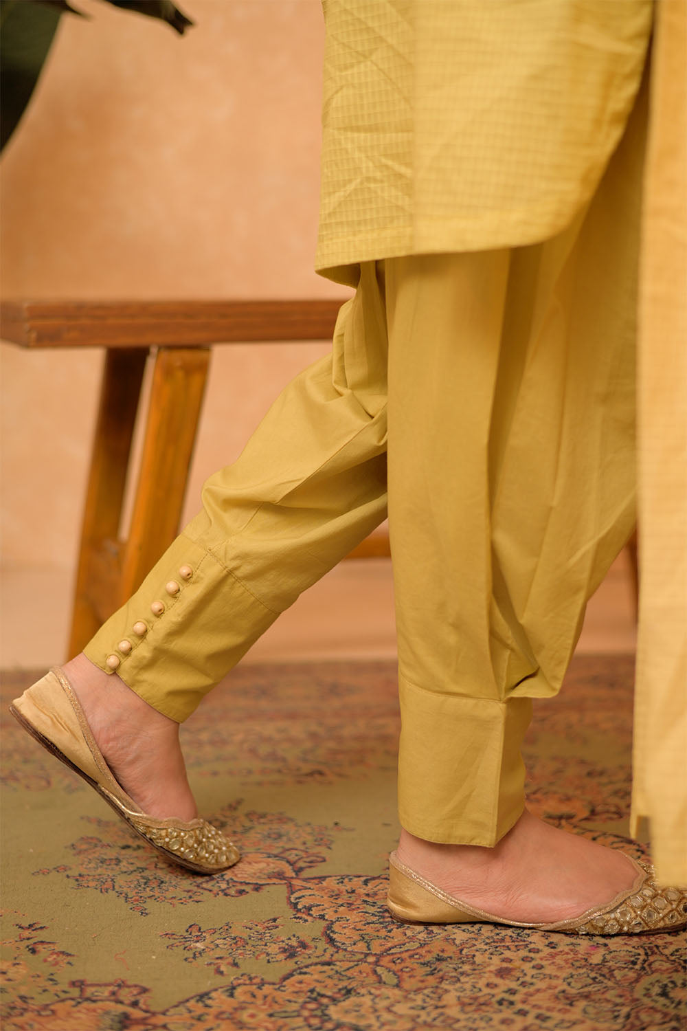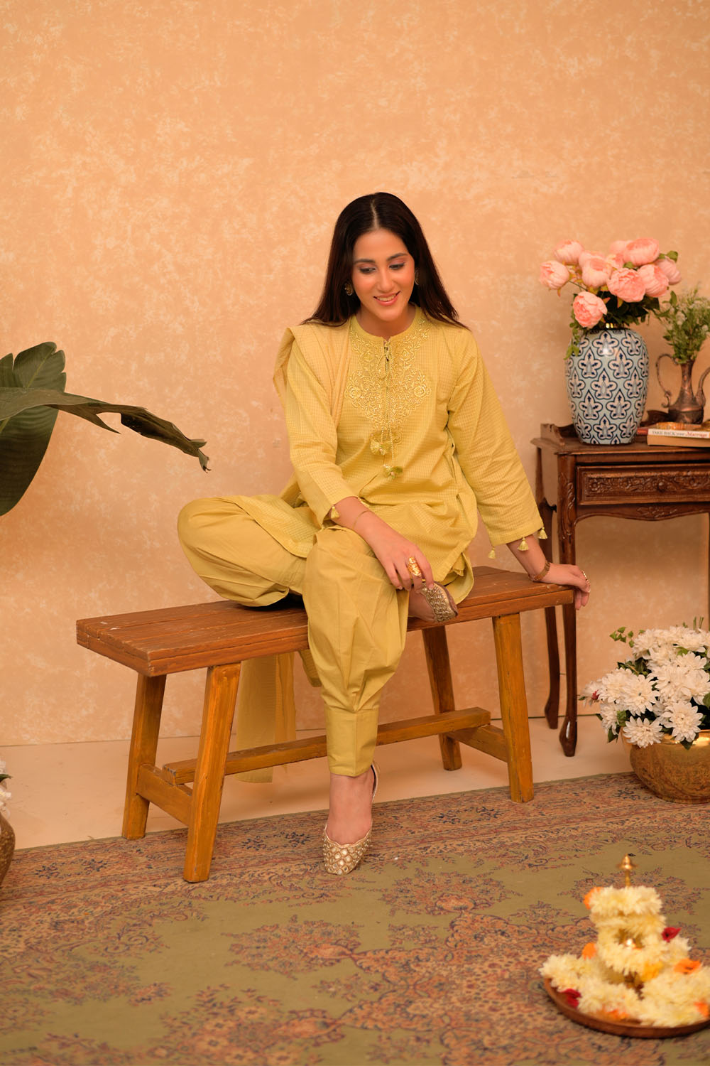 A line short shirt, with pleats on front and back. Having heavy self embroidery on neckline. Embellished with fancy dori and tassels. Paired with dupatta and stylish cuff bottoms.