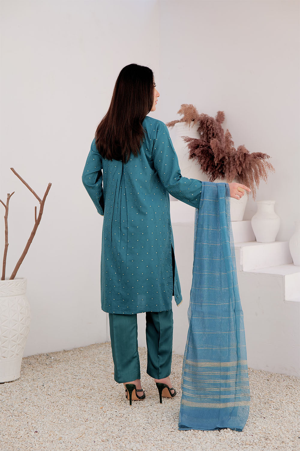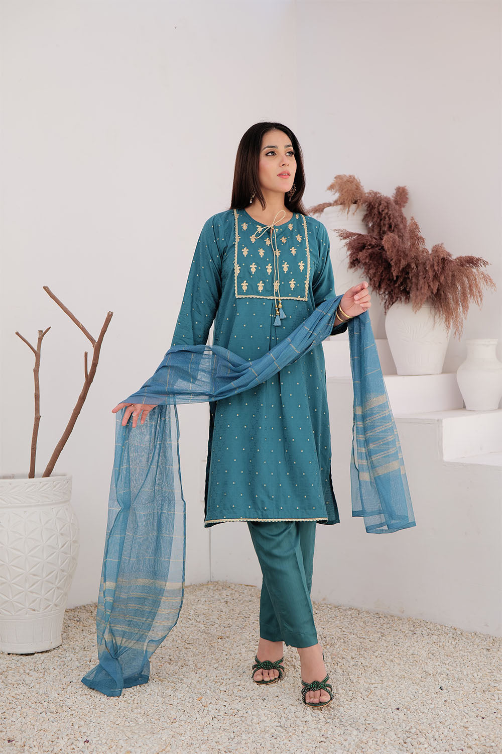 "Straight shirt, having fancy embroidery and tassel dori. Paired with straight pants and fancy dupatta".