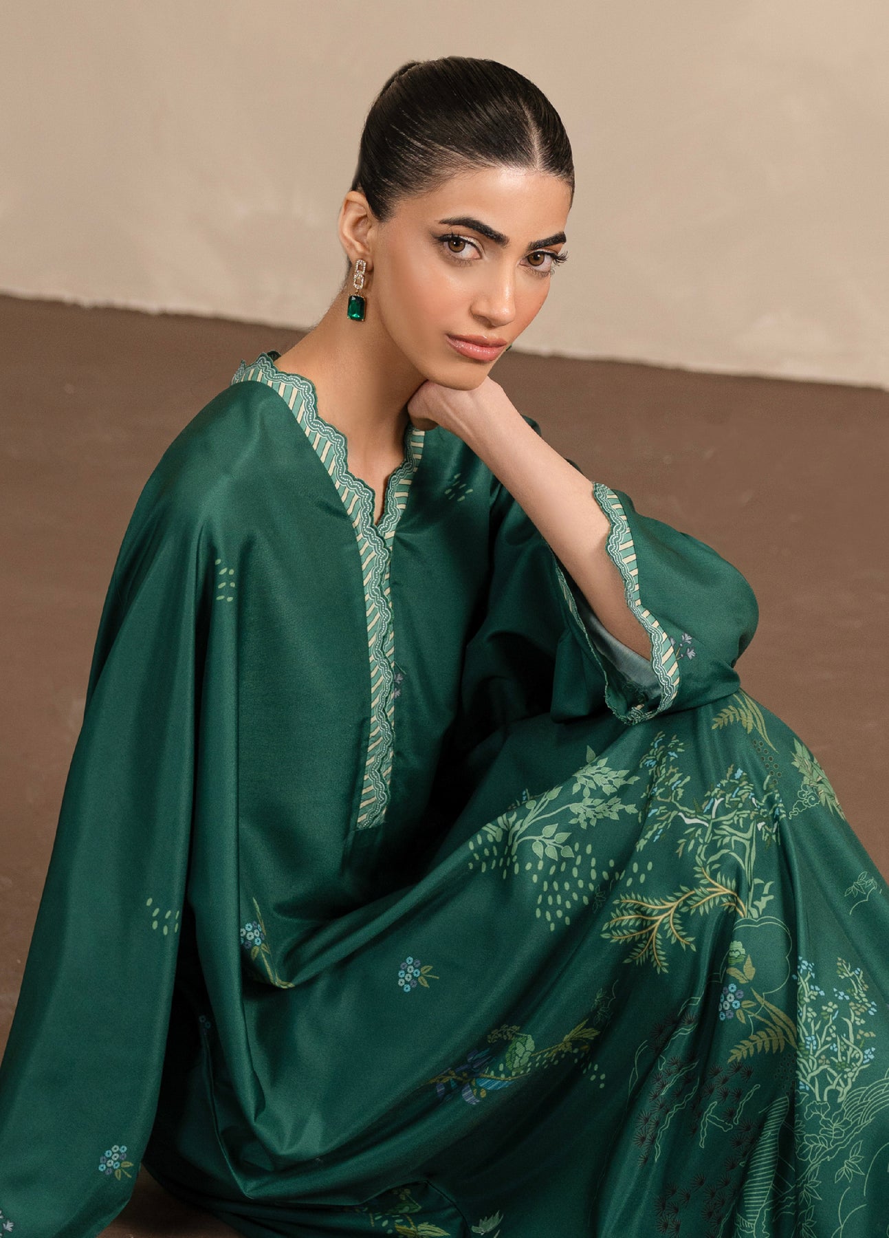Verdara is a fluid Kaftaan crafted from soft poly cambric, presented in a rich deep forest green hue. The Kaftaan features an all-over botanical print in muted tones of sage green, olive, soft blue, and subtle ivory, creating a calm, nature-inspired aesthetic. Fine scattered motifs and a delicately detailed neckline add depth while keeping the look understated. Finished without tassels, the silhouette feels clean and composed, offering a serene, elegant vibe that’s effortless and timeless—perfect for relaxed, everyday sophistication.