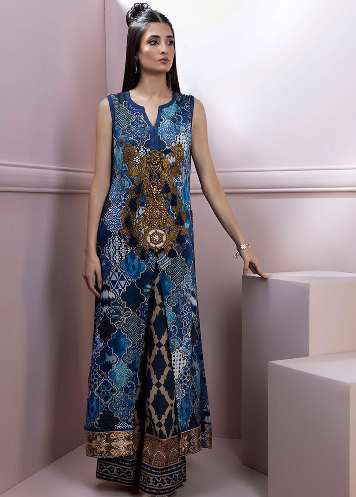 The original Shamaeel blue hues is styled as a long shirt with pocket details. Front is heavily embellished with gold, stones, dabka and thread work paired with printed trouser to give peek aboo look.