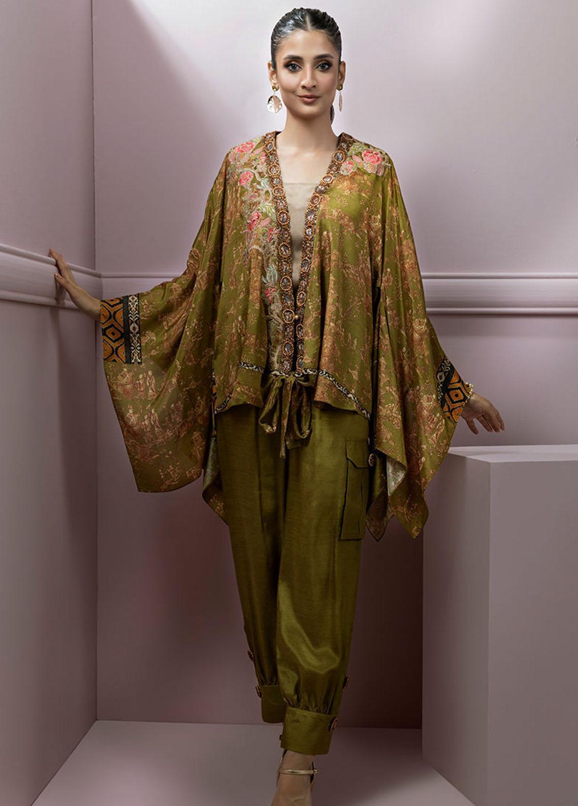 Olive green ponchi style front open shirt. Front is embellished with matte pearls, ivory and gold embroidery patti and thread work in all front neck lines. Come with plain inner and pants to complete the oriental look. Bag can be added seperately as per customer request.