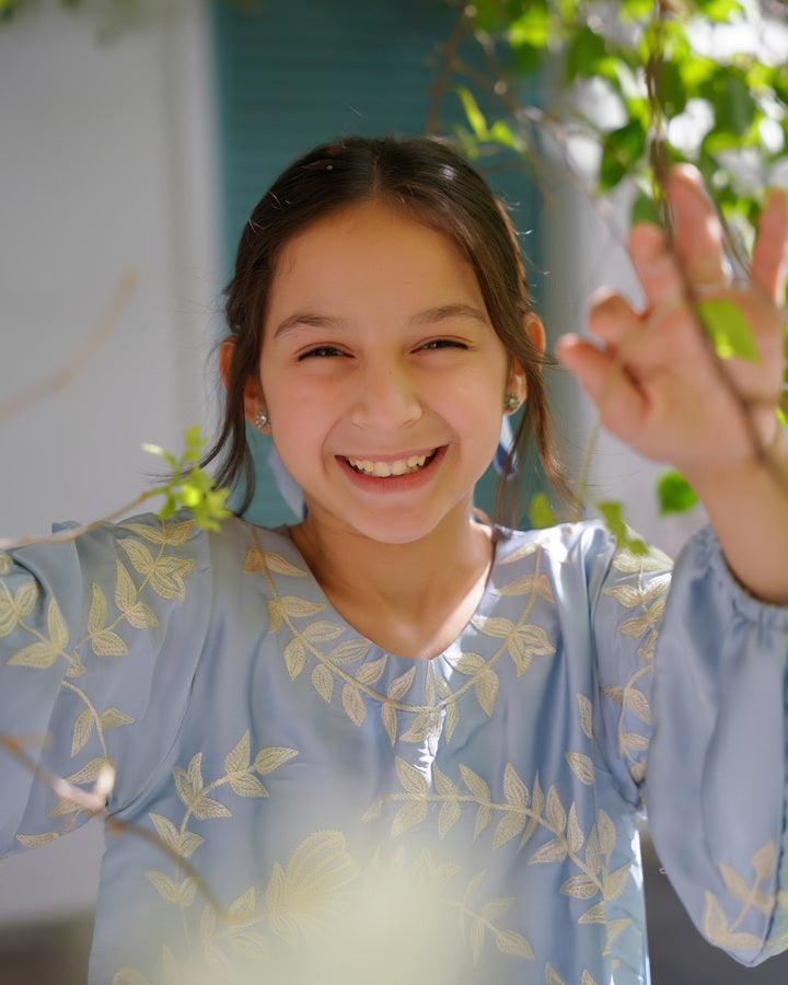 A pale blue kaftan with intricate white and gold embroidery. Refined and serene, ideal for festive gatherings.