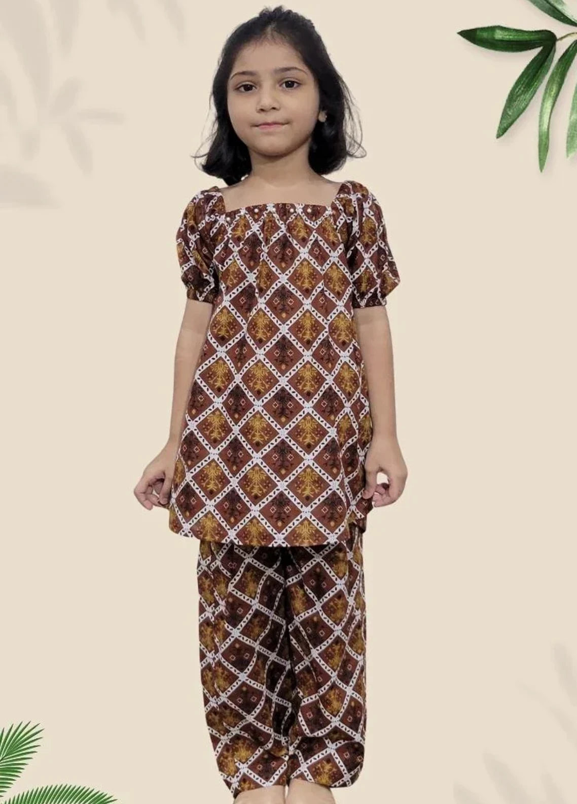 A stylish two-piece girlsโ set with a square neckline, puff sleeves, and a blue geometric floral print. Made from soft, breathable fabric with matching pants for a coordinated look.