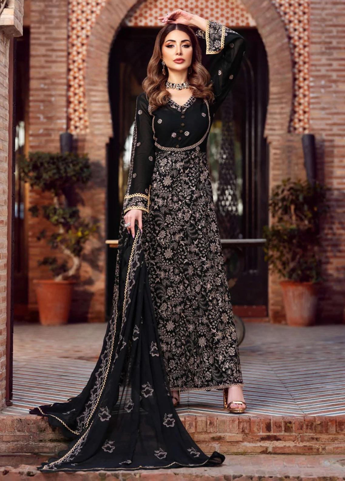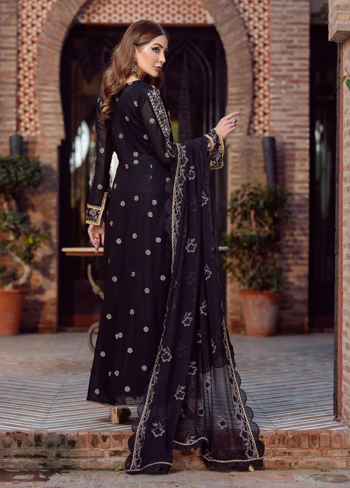 Canvased on a black richly detailed fabric with lavishly shaded embroidery laid over front and back. Assembled with chifon dupatta and plain bottoms.