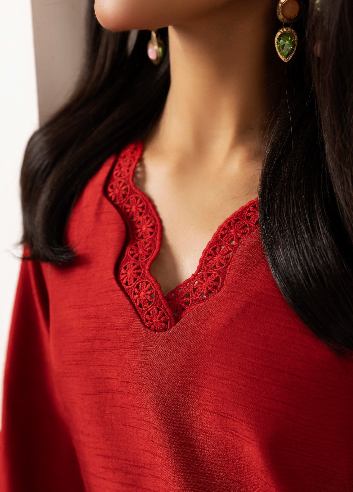 Step into refined elegance with this short-length raw silk shirt, designed with a beautiful cutline and a V-neckline featuring intricate lace and embroidered finishing along the edges. The delicate detailing enhances the neckline’s shape, giving it a graceful and elevated look. The shirt is further enhanced with lace work on the front and sleeves, paired with stylish bell-bottom trousers that create a chic, youthful silhouette. To complete the ensemble, the outfit includes an orange organza dupatta adorned with 4-side embroidered borders, offering the perfect blend of festive charm and contemporary style.