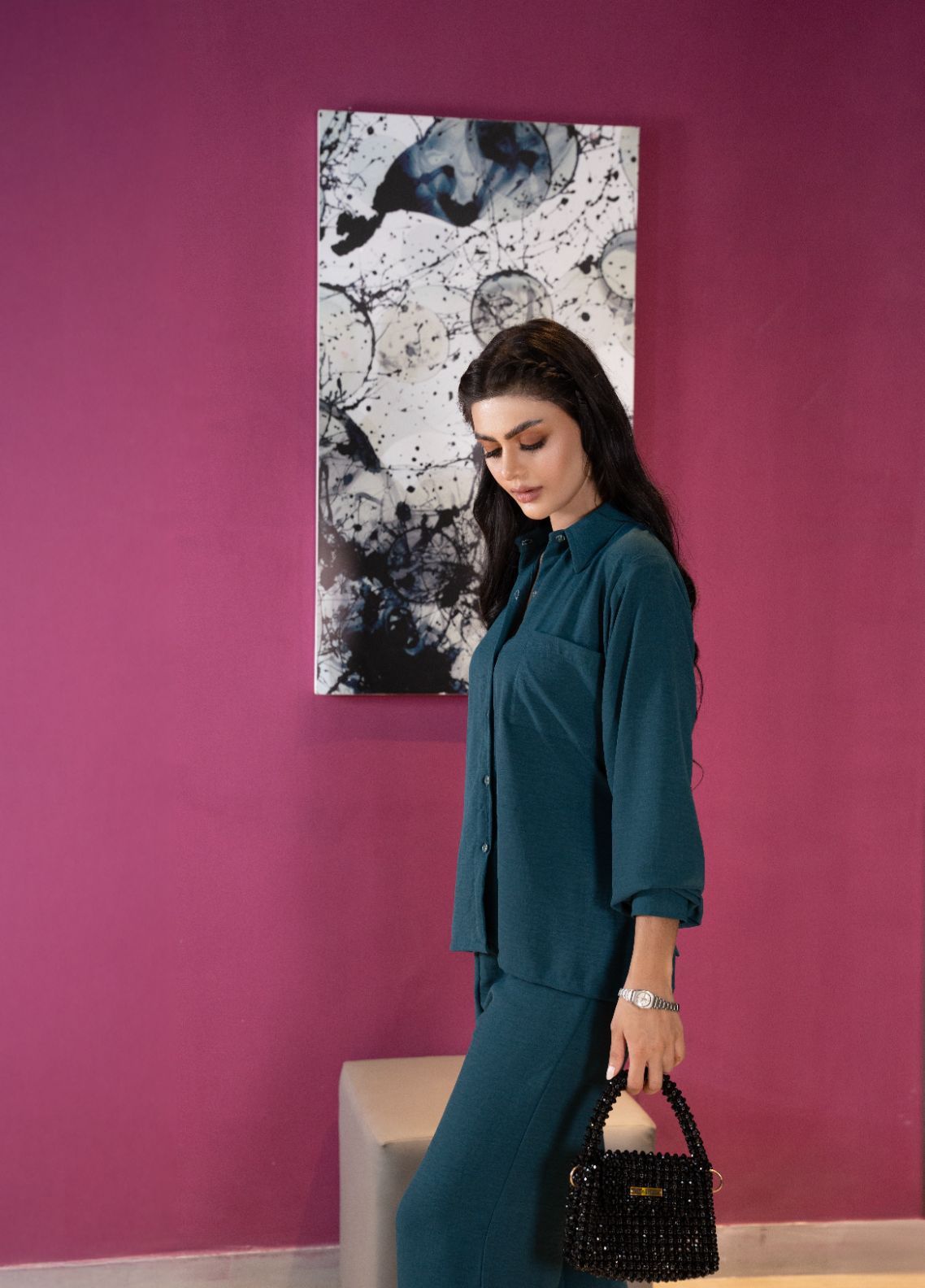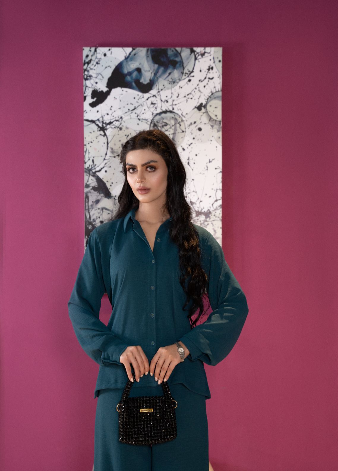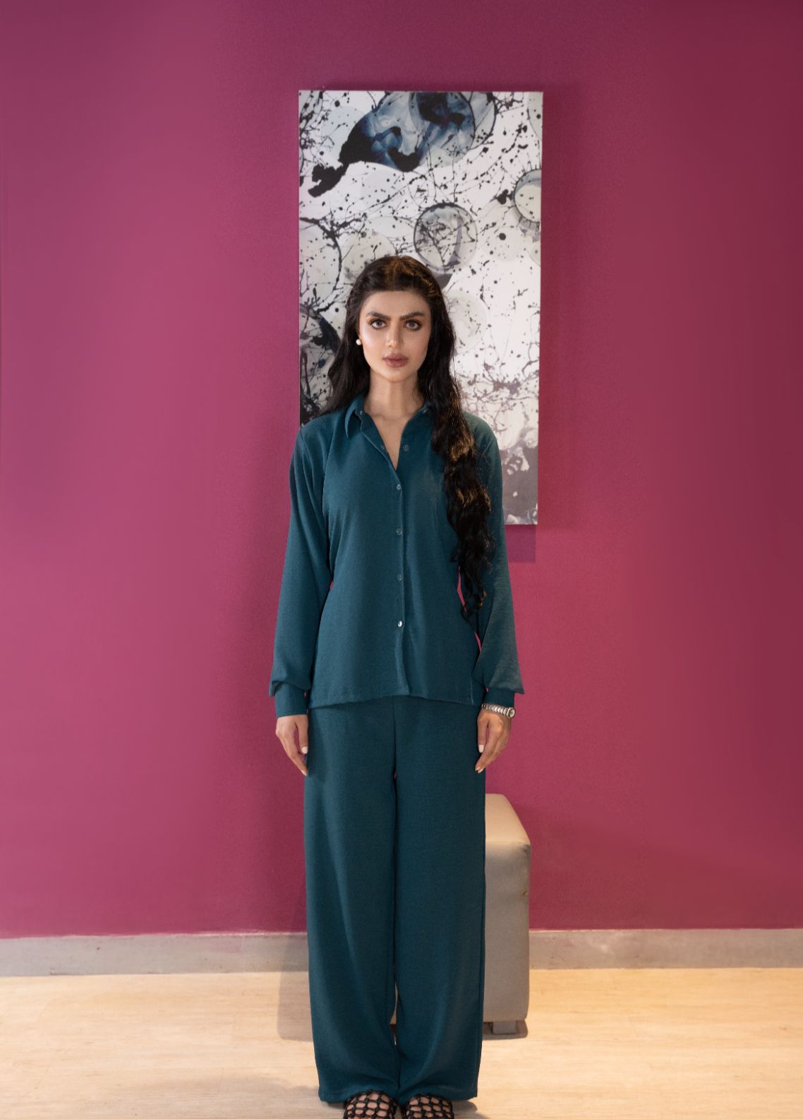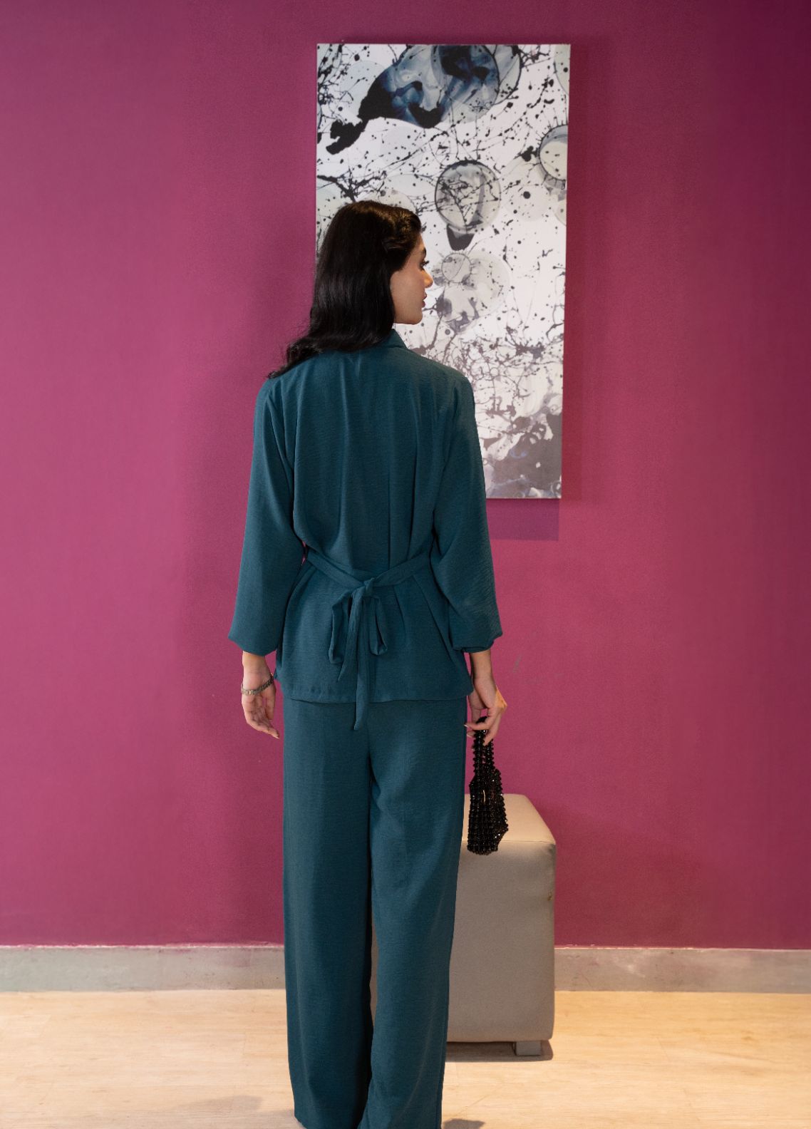 This teal co-ord set features a button-down shirt with collar, a removable belt you can style your way, and straight pants.