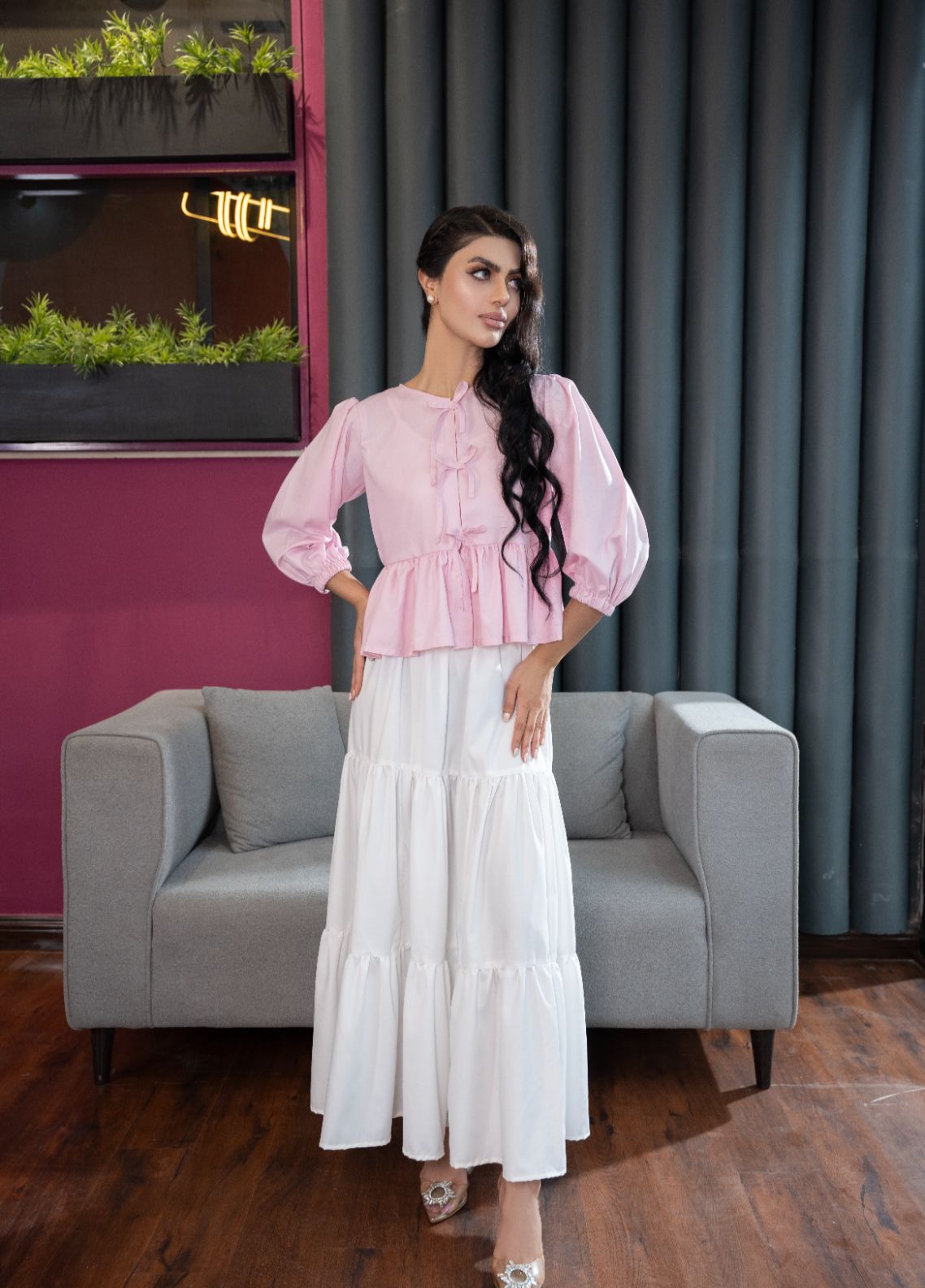 A flowy white skirt featuring delicate ruffled layers, designed to bring effortless movement and timeless elegance to your wardrobe.