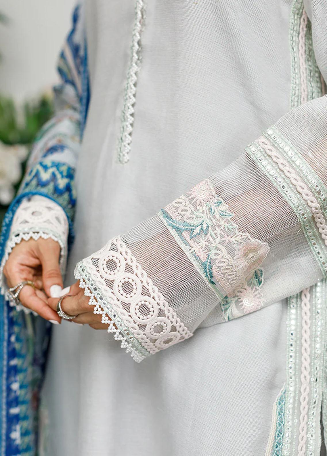 Elevate your style with our ice blue cotton net tunic, exquisitely embroidered from sleeves to bottom. Delicate lace and mirror work adorn the edges, while the neckline shimmers with pearl embellishments. Effortlessly elegant, this ready-to-wear tunic is perfect for any occasion. Paired with a digitally printed dupatta