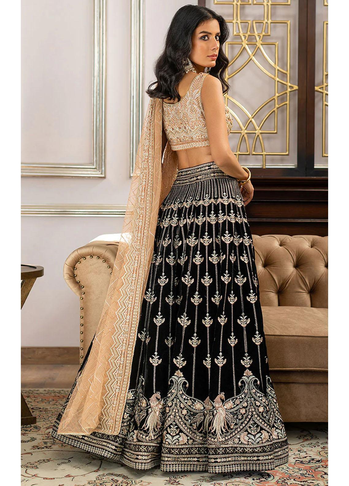 Peach tone net embroidered blouse with intricate thread, zari, handwork, sequin, gotta and kora dabka detailings. Black embroidered velvet lehenga with botanical and avifauna thread, zari and sequin patterns for a charming look