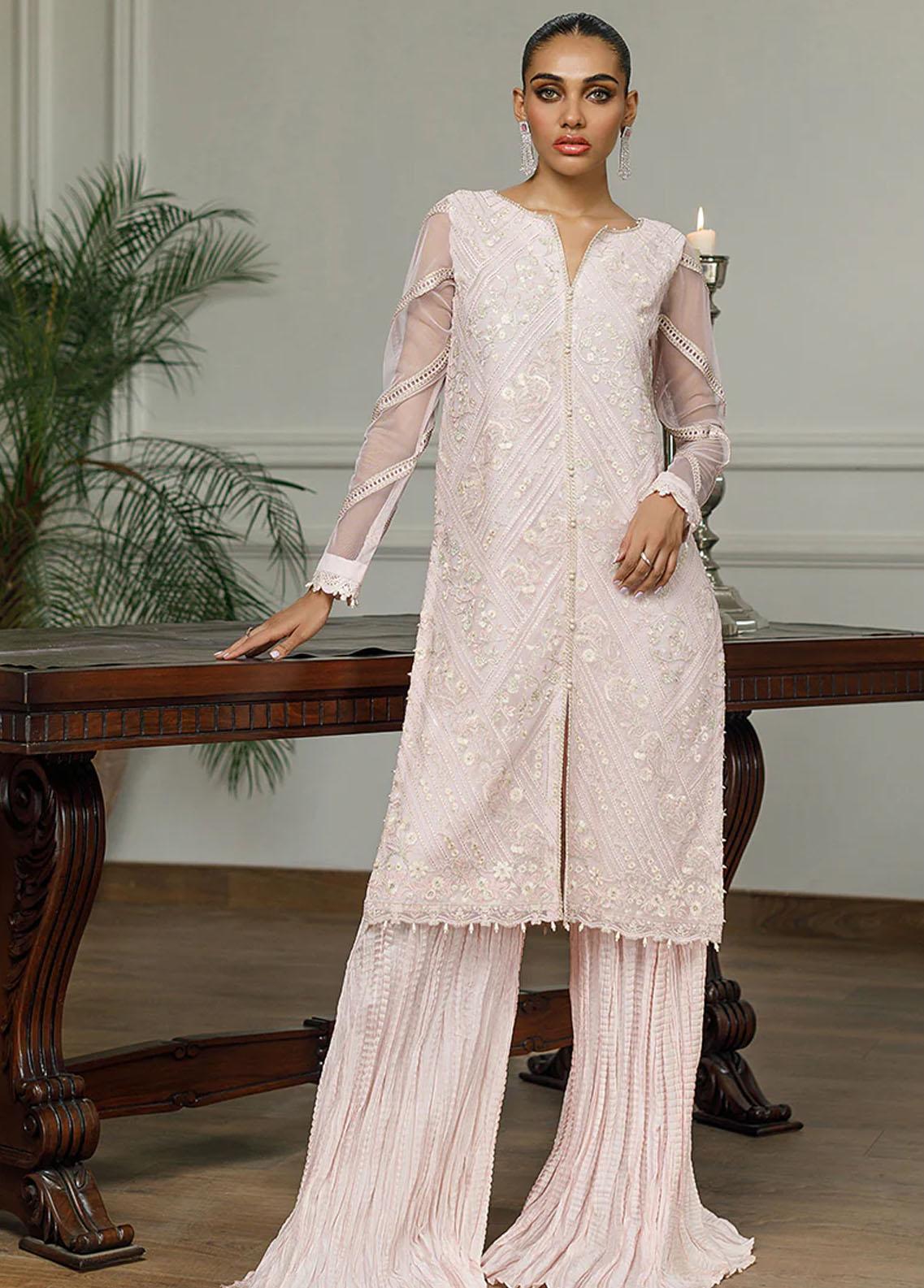 Net embroidered shirt in pink shade with intricate patterns of thread and zari work. The shirt is decorated with pearl, lace and bead work for a graceful look