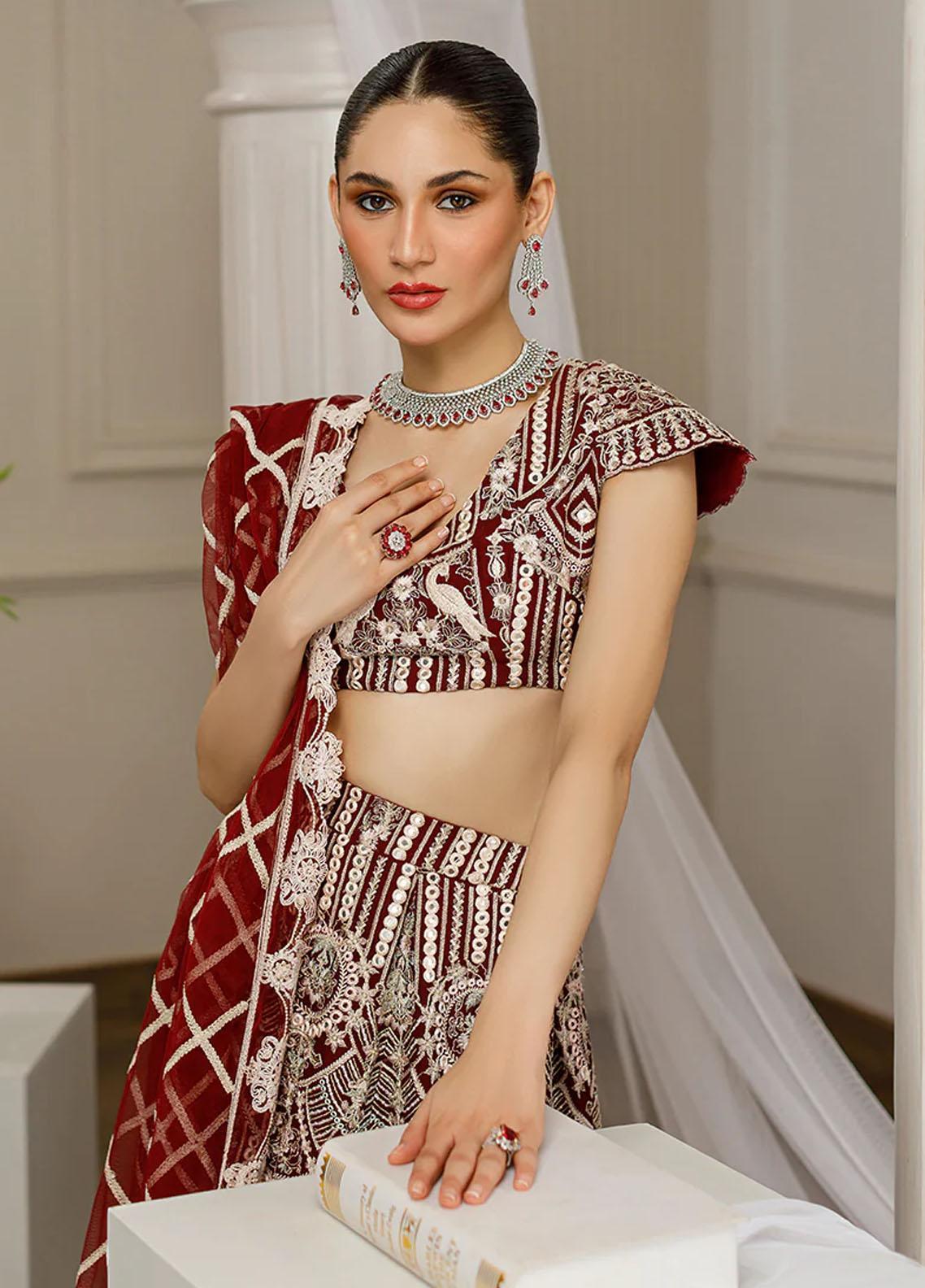 Maroon shaded chiffon embroidered blouse with v neck at the back with avifauna and botanical patterns of thread zari and mirror work paired with skirt illustrated with thread zari and mirror work patterns and cutwork edges for a consummate look Parts Chiffon embroidered blouse with side zipper Chiffon embroidered skirt with lining and cancan inside