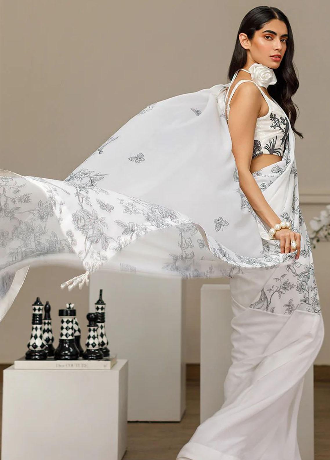 Experience true grace with our captivating off white front open gown intricately crafted from chiffon and masterfully embroidered with a nature inspired design It s all in the details a hint of shimmer comes from the sequins that ornament the botanical embroidery A collar neck design sets this striking piece apart topped off with looped buttons for an extra flair Despite the intricate front detail the gown s back remains elegantly plain to balance the design a striking representation of a refined and stylish aesthetic Claim your Chiffon Embroidered Gown today and embrace elegance