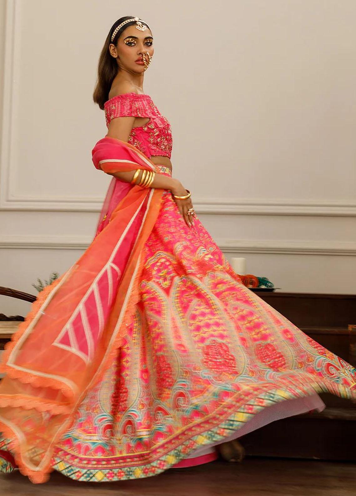 Experience the allure of radiant hot pink with this intricately designed net embroidered blouse Adorned with handwork thread dabka and zari floral patterns this blouse redefines elegance and sophistication The beautiful craftsmanship is coupled with a banarsi self jamawar printed lehenga making it an absolute must have for a vibrant and enticing look Parts A meticulously handcrafted embroidered net blouse with added convenience of side zip A refreshingly elegant printed lehenga that s lined and equipped with a cancan inside for added flare Be prepared to turn heads and steal glances with this stunning ensemble