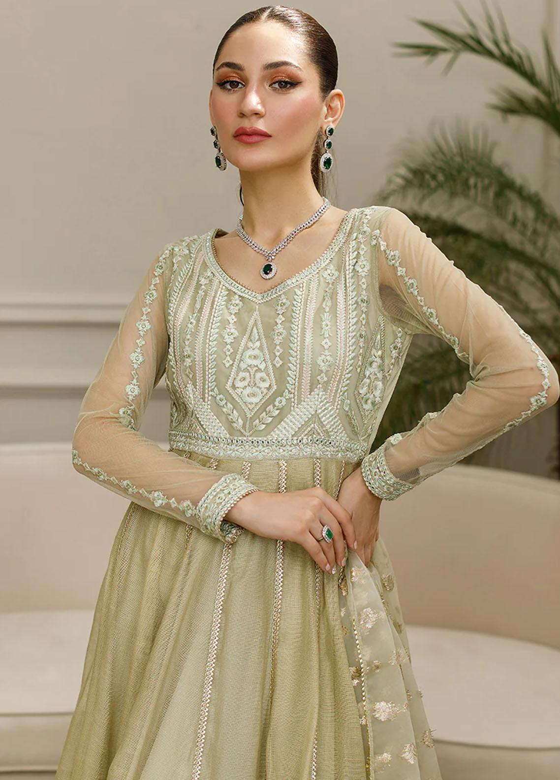 Sage green tone khaddi net embroidered dress with thread zaree and sequins work on body with neckline adorned with mirror work and gota lace Gota laces are attached parallel to each other to the maxi frills with lace border finishing on the hemline for a graceful and charming look Parts Net embroidered dress with lining and cancan inside