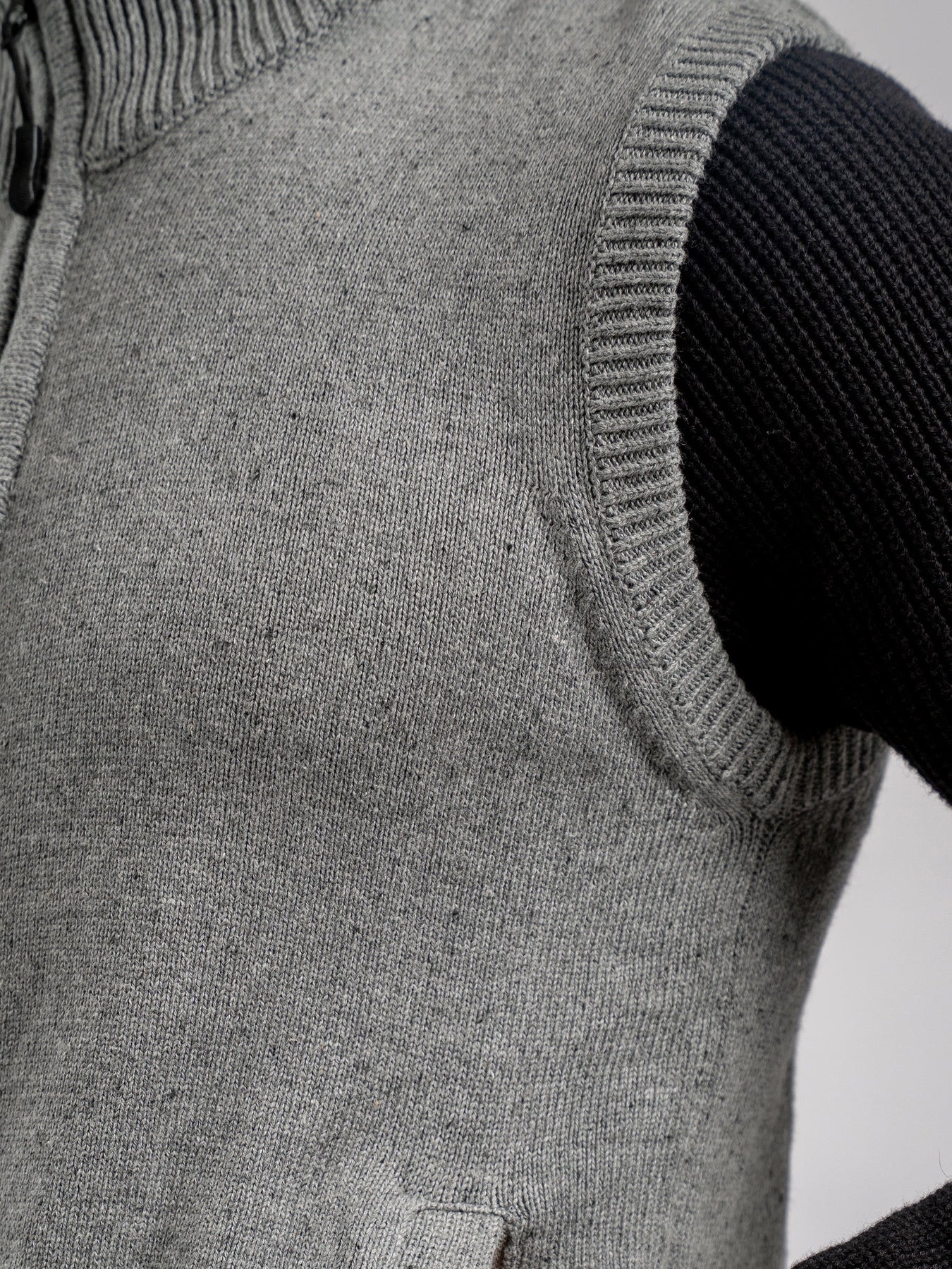 A modern layering essential, this sleeveless zipper sweater is crafted in soft grey neppy knit for a textured look. Featuring a sleek front zip with mock neck, ribbed trims & ribbed hem. Perfect for versatile styling—whether worn over a shirt for a smart touch or paired casually with shalwar kameez.