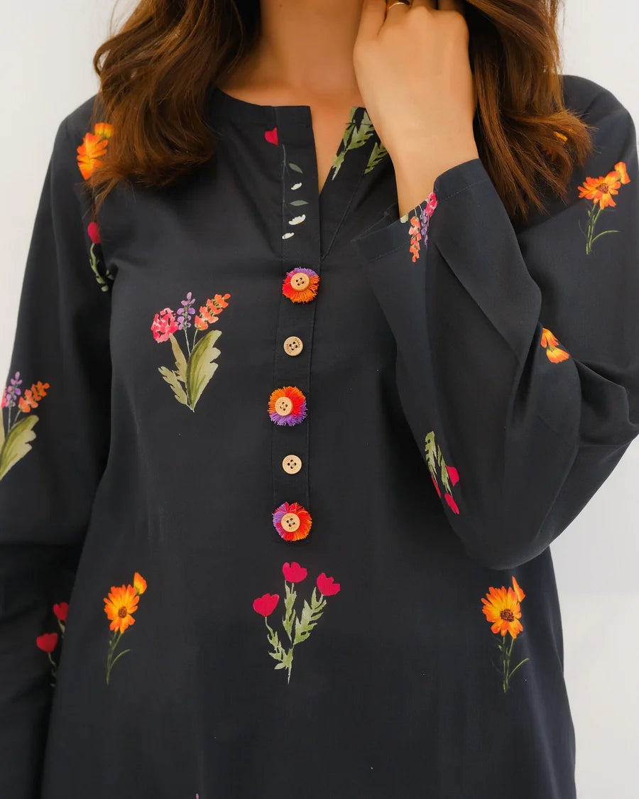 Step up your wardrobe with our exquisite printed Matching separates. This stunning 2-pc enhances intricate button detailing on the neckline of the shirt with convenient side pockets, and perfectly paired trousers.