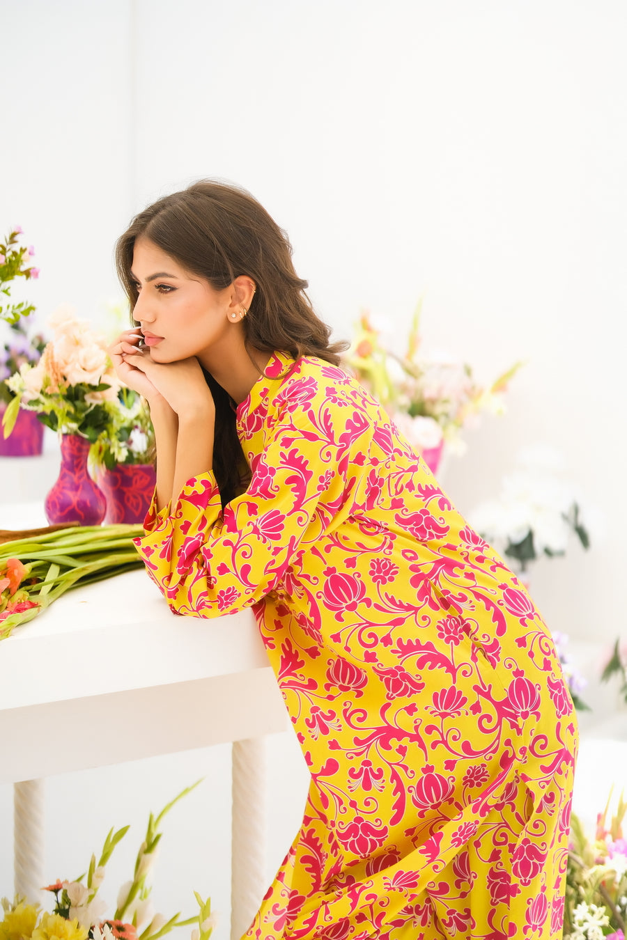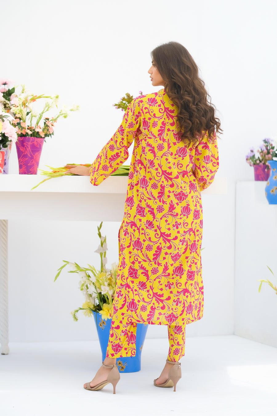 Step up your wardrobe with our exquisite printed Matching separates. This stunning 2-pc enhances intricate button detailing on the neckline of the shirt with convenient side pockets, and perfectly paired trousers.
