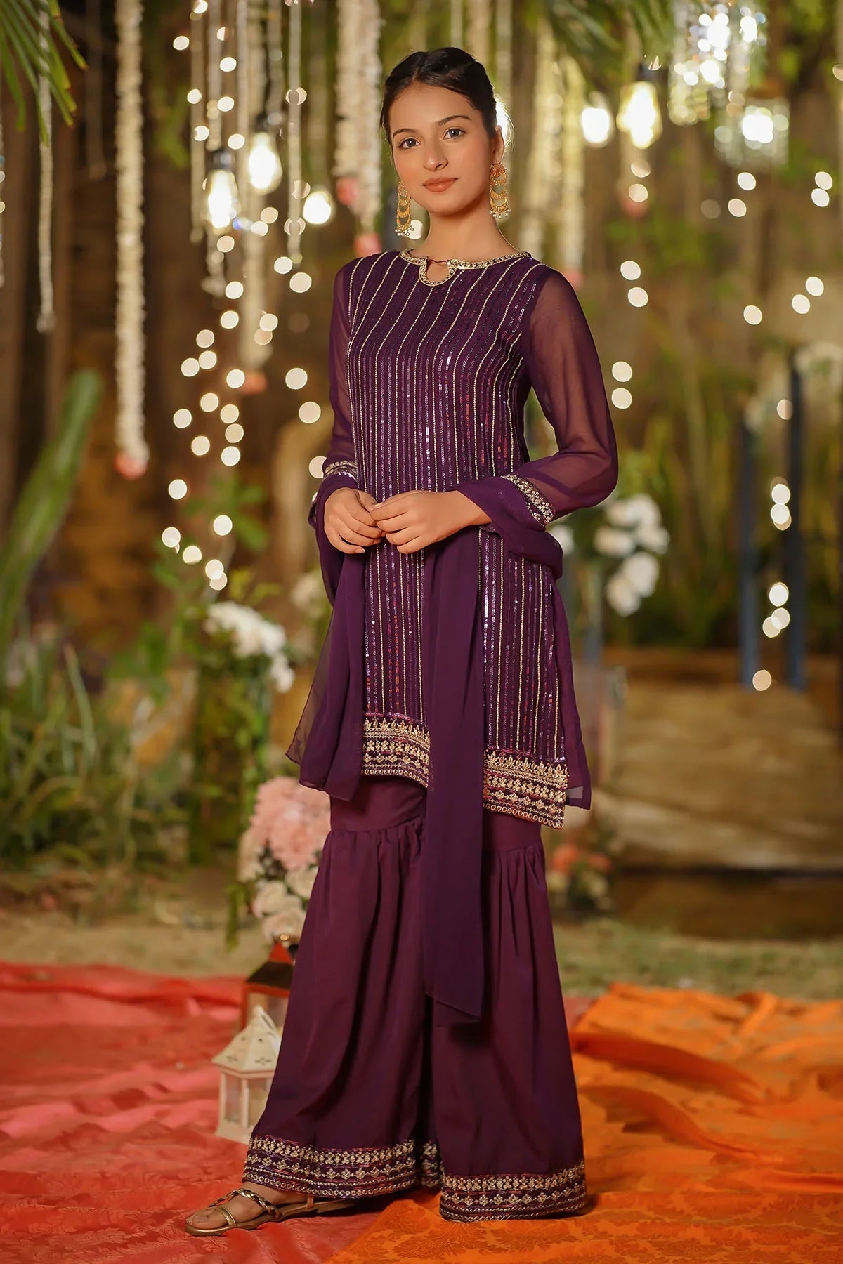 Bottom: Purple Malai Crepe Gharara Pants with Embroidery