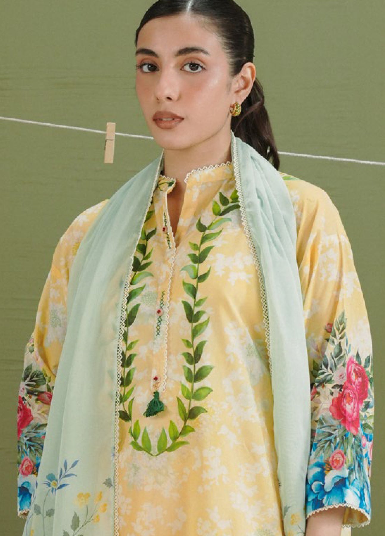 The dupatta features a dusty blue floral print. The shirt is printed with yellow floral motifs, while the trouser is finished in yellow with a scalloped border.