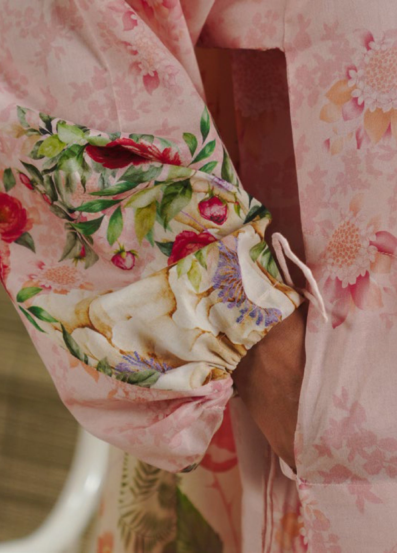 The dupatta carries an off-white floral print. The shirt features blush pink floral motifs, paired with blush pink trouser finished with a scalloped border.