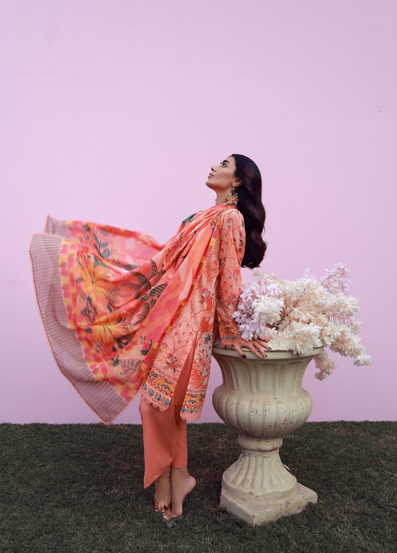 Warm coral and peach hues layered with oversized tropical florals for a sun-kissed feel. The flowing dupatta echoes the printโs vibrancy, paired with subtle pants for balance. Joyful, expressive, and summer-ready.