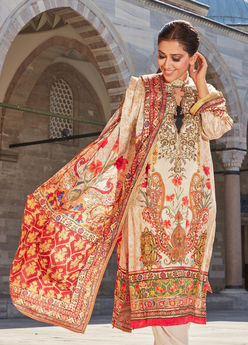 In cream with jewel coloured daman, bold floral patterns are inspired by bygone frescos and Mughal motifs and exude delicate opulence. Dupatta and shirt both feature gota lace and shirt is hand worked with naqshi motifs and embroidery. Pants are finished with gota lace
