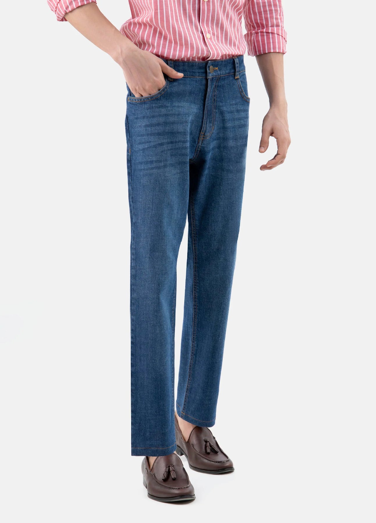 An everyday classic, our blue jeans offer comfort and ease for everyday wear. Made in casual fit cut & dark washed that adds depth to the fabric making them suitable for both relaxed and semi-casual settings.Finished with front whisker look, orange stitch detailing & brown embossed leather patch at the back.