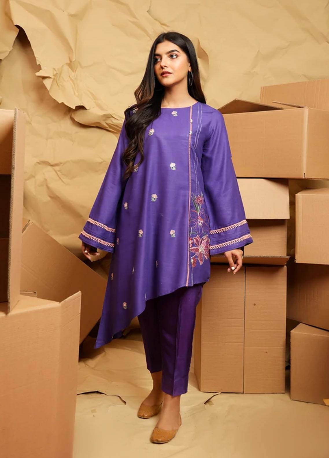 A flowy purple kurta that is adorned with pink embroidery on the hem.