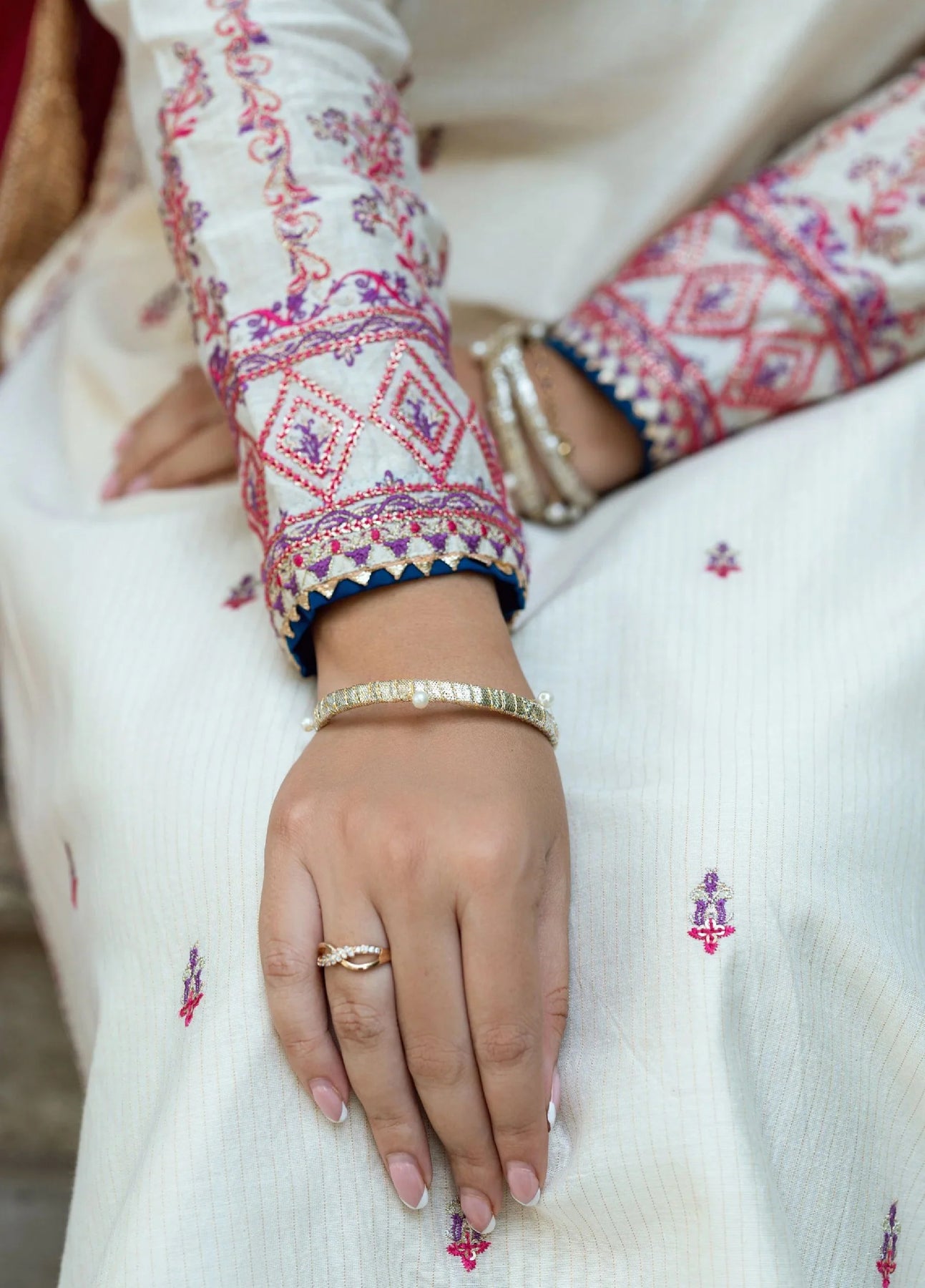 Shirt: Off white cotton susi straight long shirt with body cut, key hole embroidered neckline and sleeves with Rajasthani-inspired fabric manipulation, embellished with gota details.