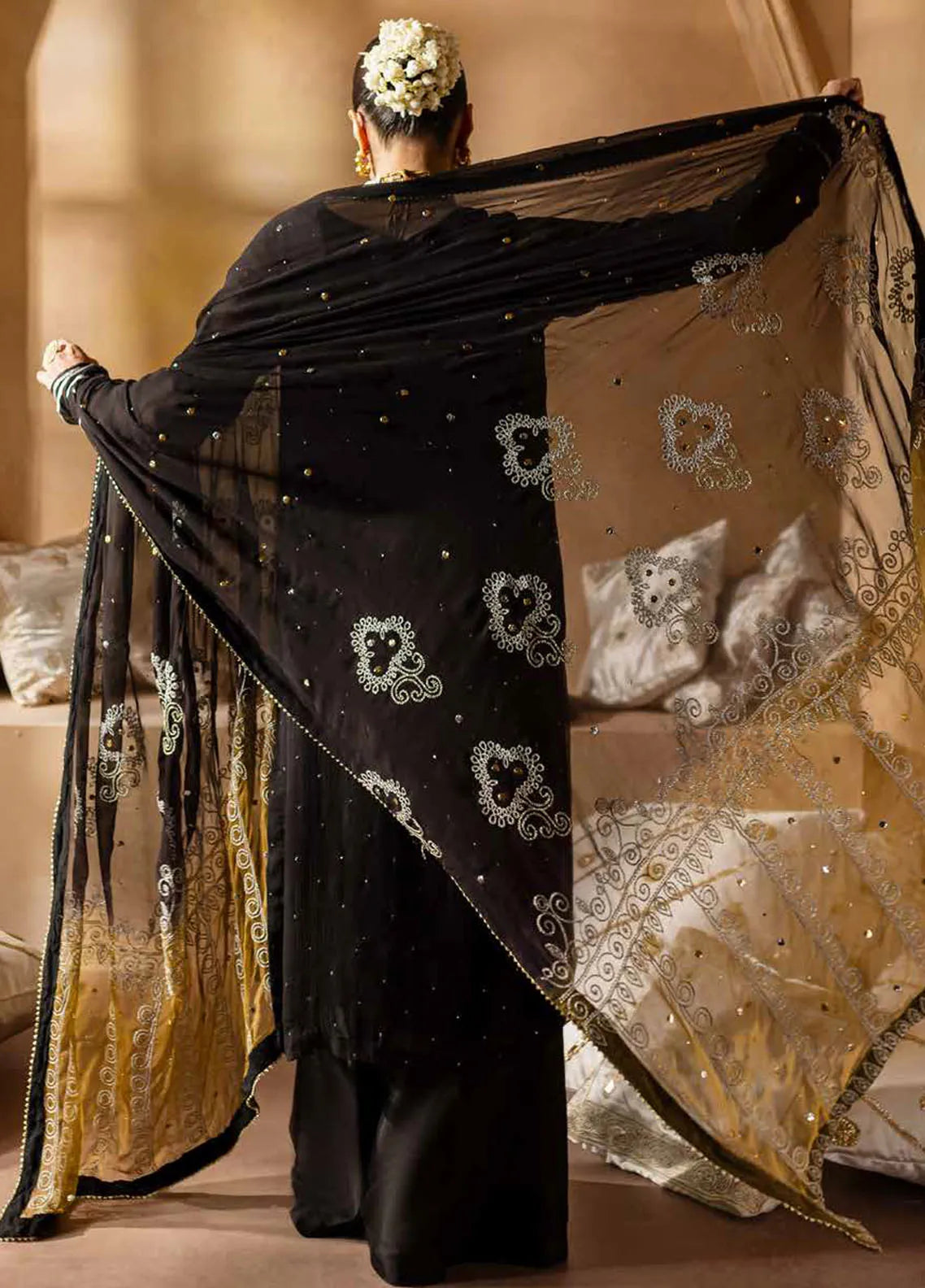• Aari Embroidery Chiffon Dupatta With Mukeshkari