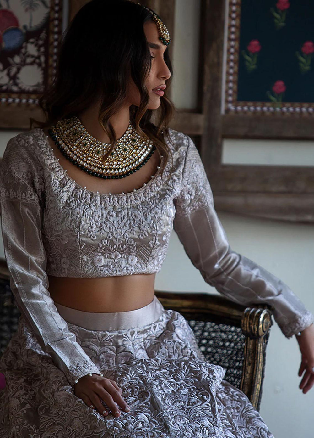As the demand for style and glamorous look get even more defined. This tissue organza is fully embroidered with meticulous interest embroidery work . Lehenga has beautiful cutwork details .PartsBlouse with pearls finishing. Attached lining and zip on side seam for perfect fit.Lehnga with lining ,adjustable belt and cancan inside.