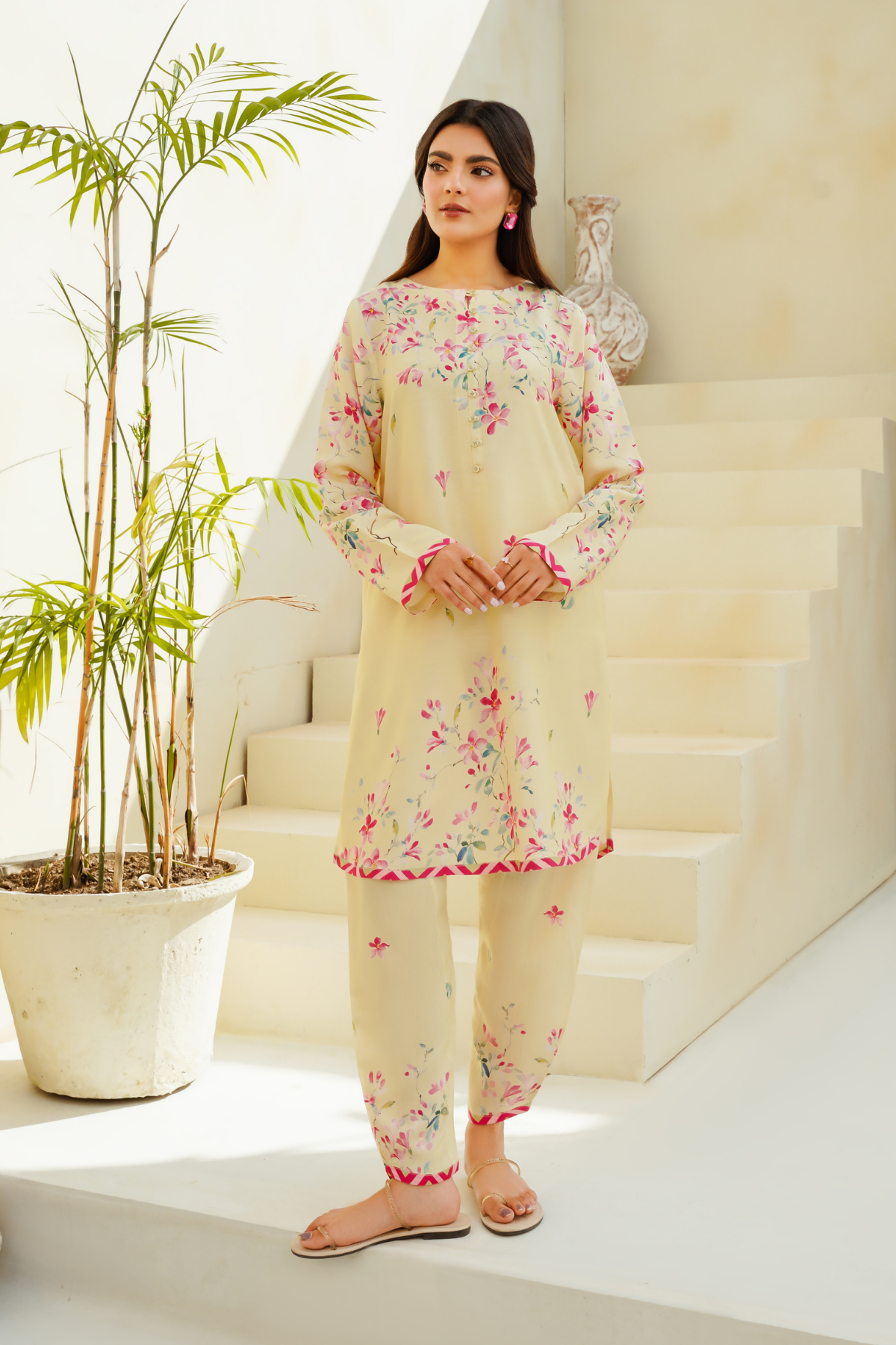 Design: Straight-cut kurta with floral print and contrast detailing along the cuffs and hemline