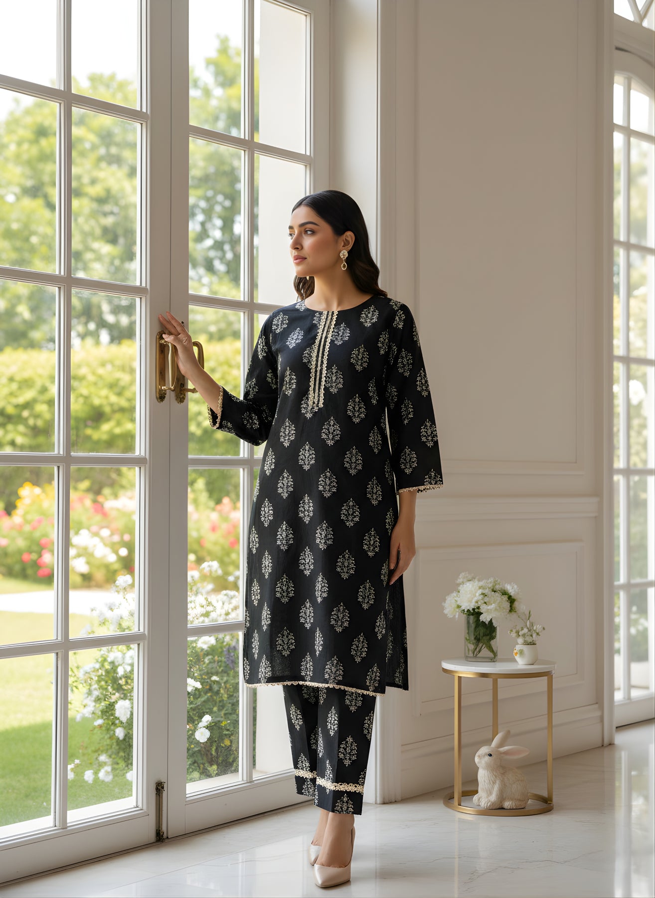 A classic black base with intricate white block-print motifs. Ideal for evening iftars and formal gatherings.