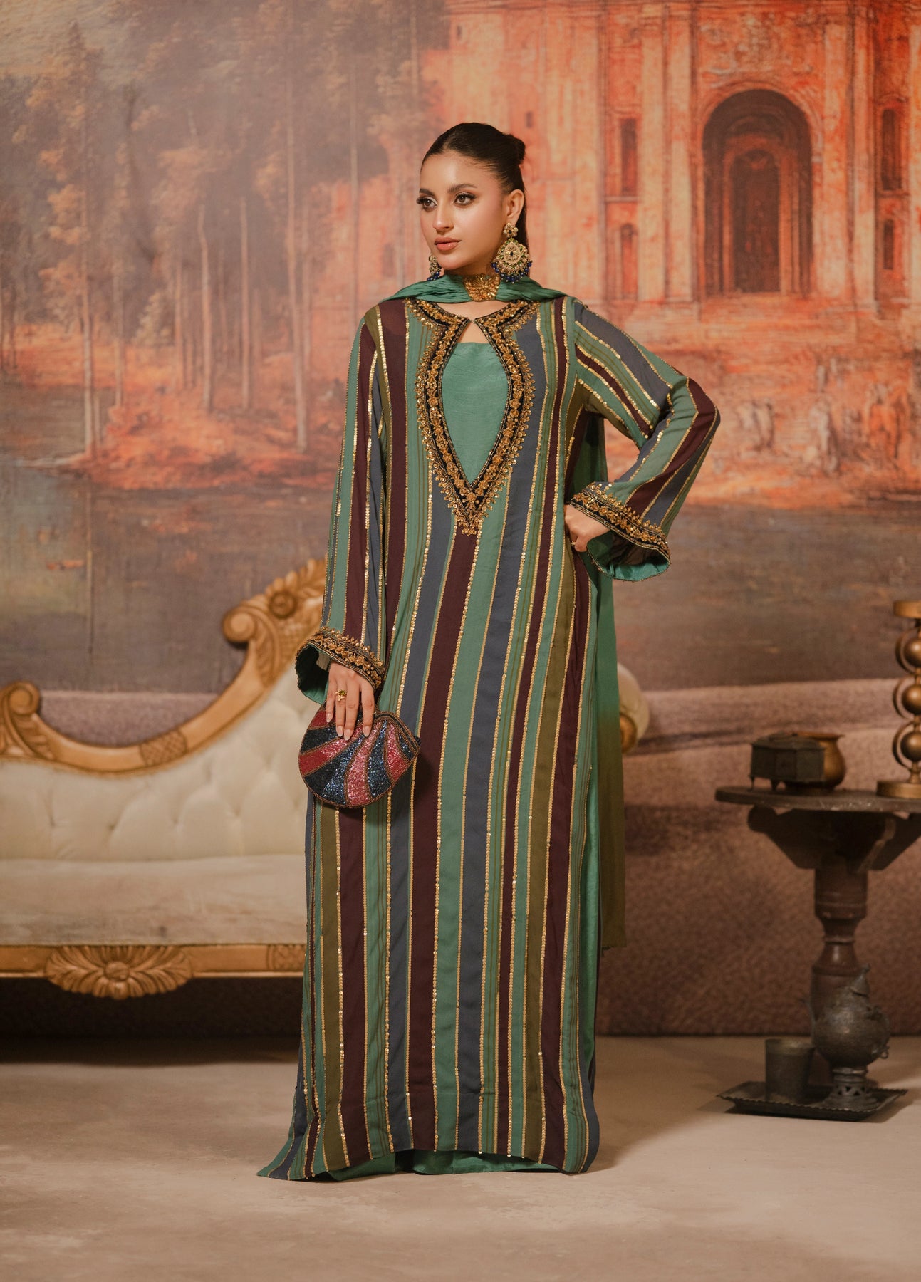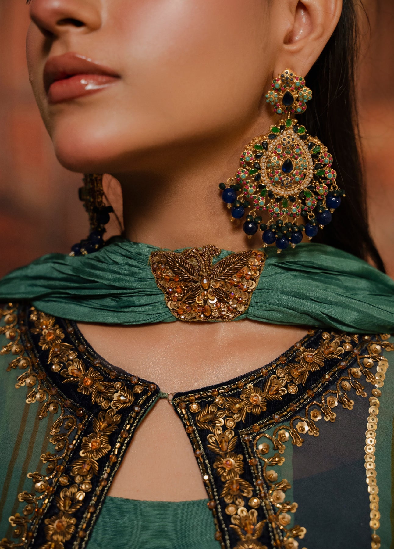 LIA - Festive Formal - VOL 3: The ensemble features a digital printed straight long shirt exquisitely adorned with zardoze and sequins embroidery all over. Features navy blue appliquéd velvet accent neckline and sleeves hem, the keyhole shaped contrasting neckline and sleeves are embellished with sequin and zardoze handwork embroidery. Pearl and bead finishings. Paired with Bamboo raw silk floor length culottes and under shirt. Paired with tailored medium silk butterfly choker neck dupatta. Exudes an air of effortless elegance, making it the perfect choice for any occasion.