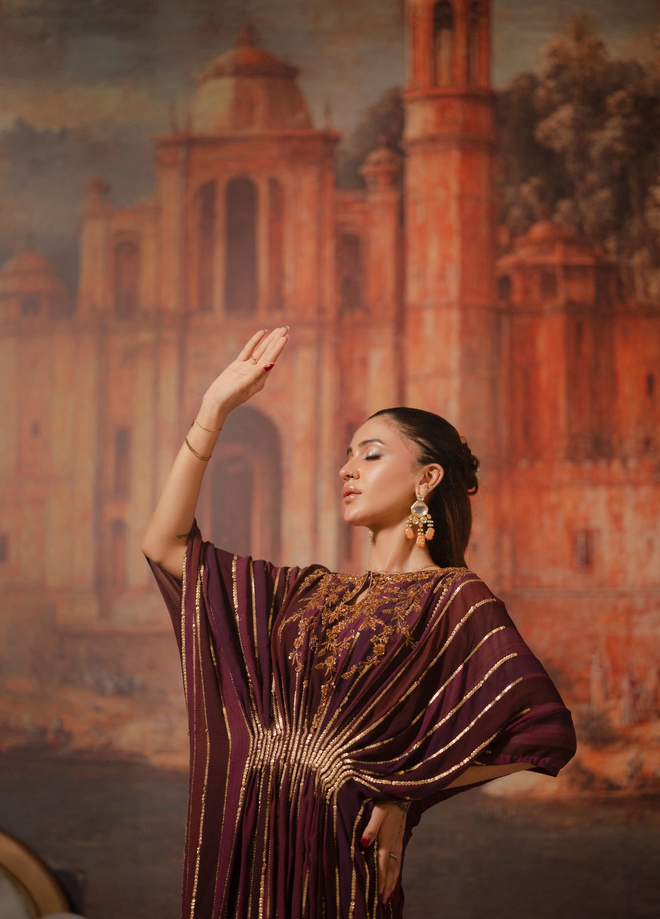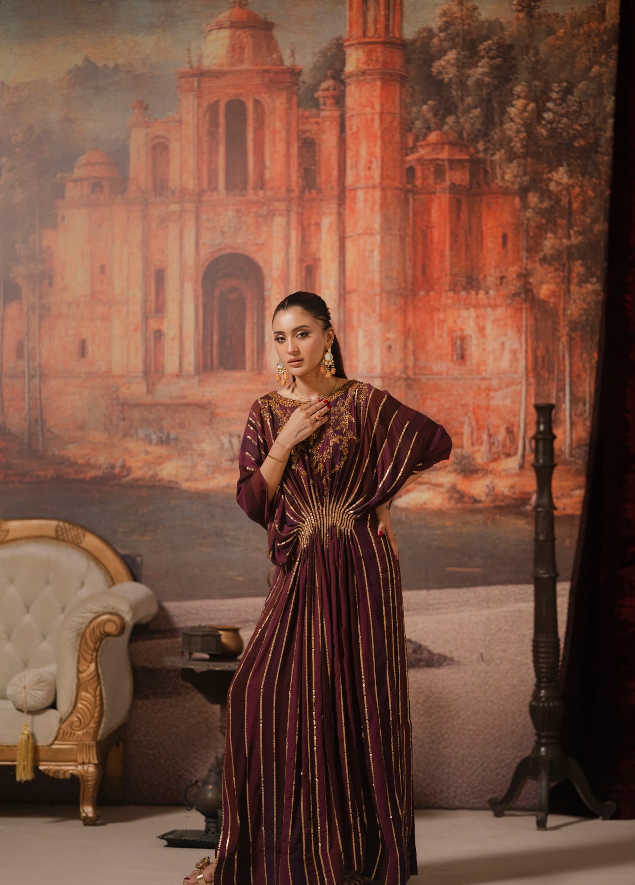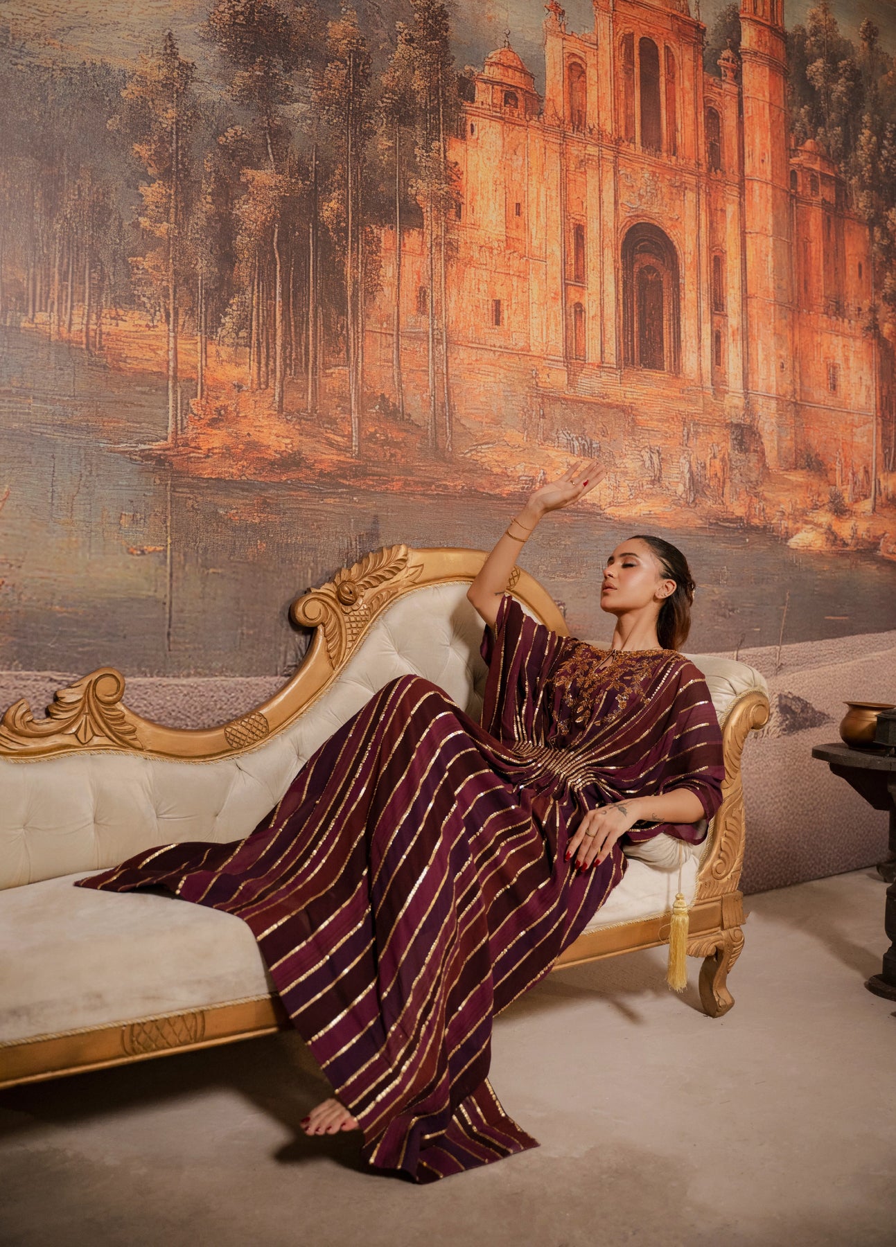 LIA - Festive Formal - VOL 3: The ensemble features a digital printed kaftan exquisitely adorned with zardoze and sequins embroidery all over. Pearl and bead finishings. Paired with Bamboo raw silk straight pants and under shirt. Exudes an air of effortless elegance, making it the perfect choice for any occasion.