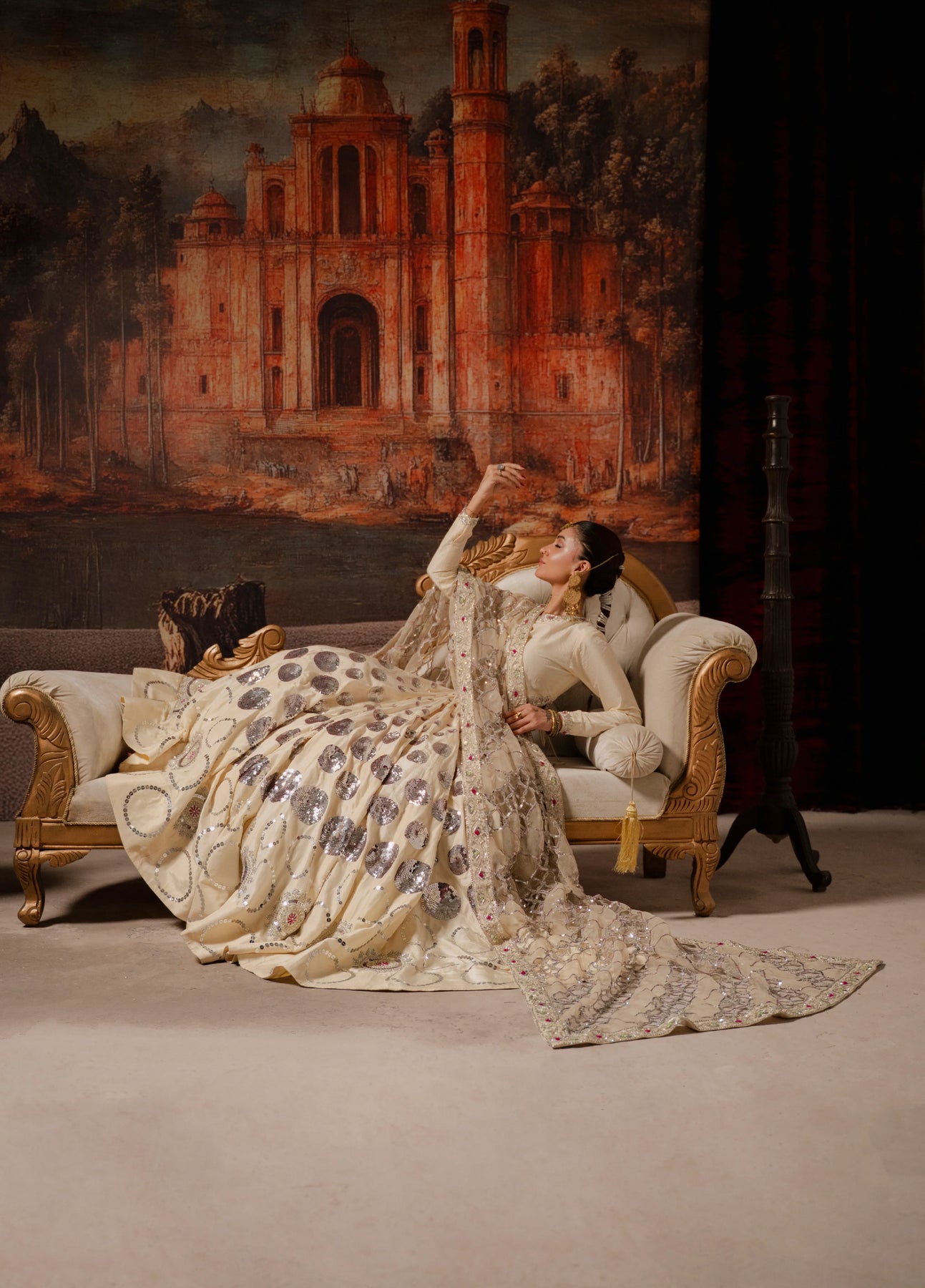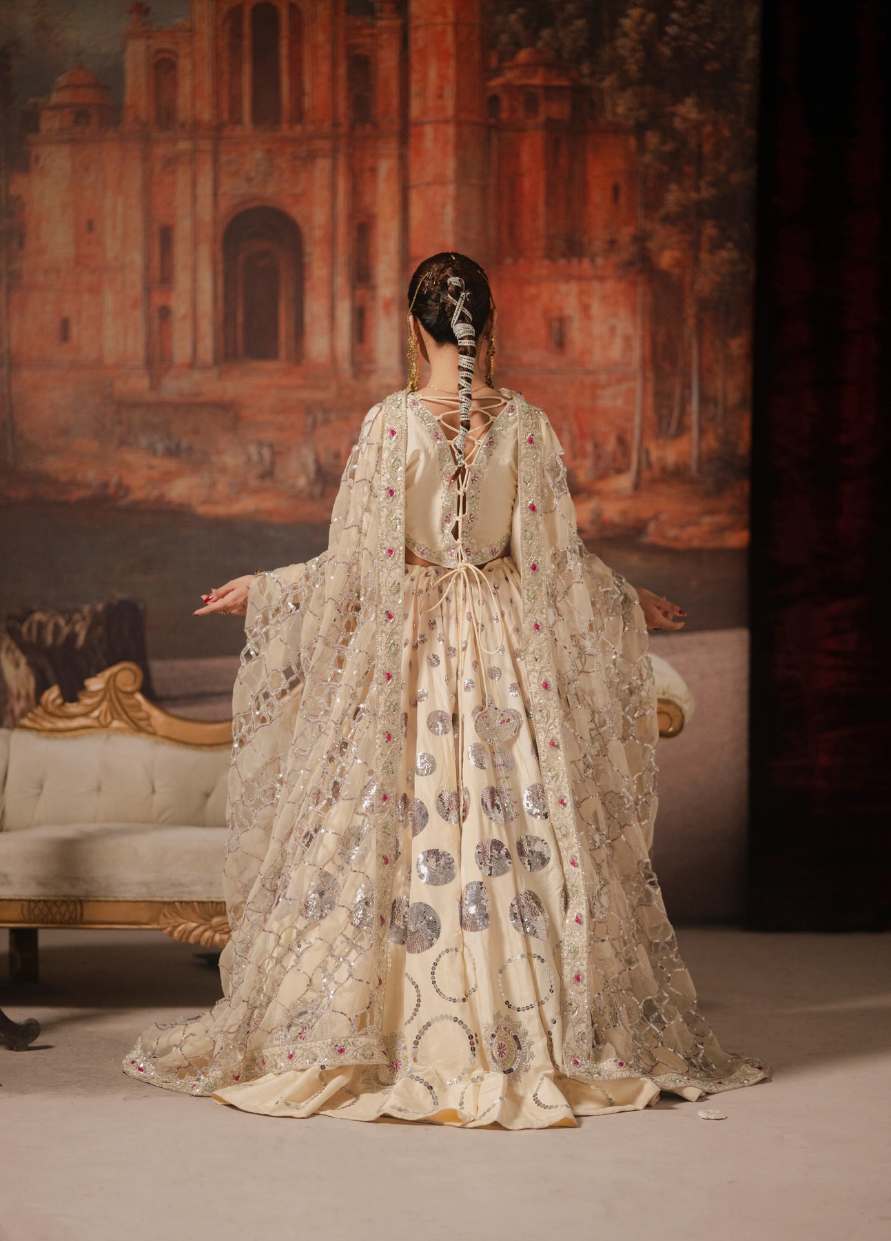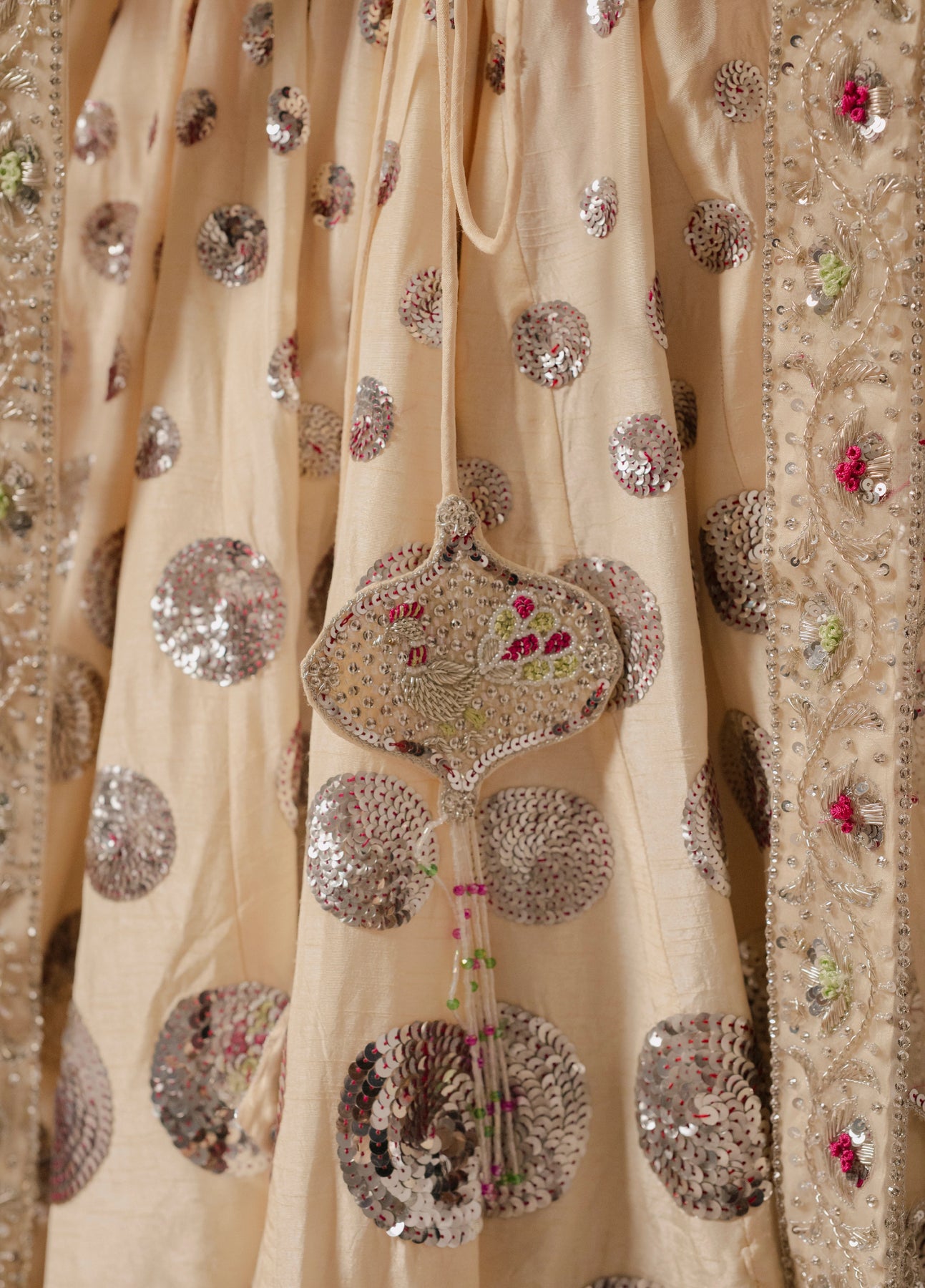 LIA - Festive Formal - VOL 3: A glamorous pale butter yellow hued Korean rawsilk choli with open back is elevated with a organza cutwork and hand embroidered dupatta, resplendent in a floral border embroidered with zardoze and accent resham details. The korean rawsilk matching voluminous lehenga, fully hand embroidered sequin circles and zardoze motifs. The choli is adorned with delicate embroidery creating a floral border of zardoze, resham, and glistening sequins on the choli; evoking a timeless charm.