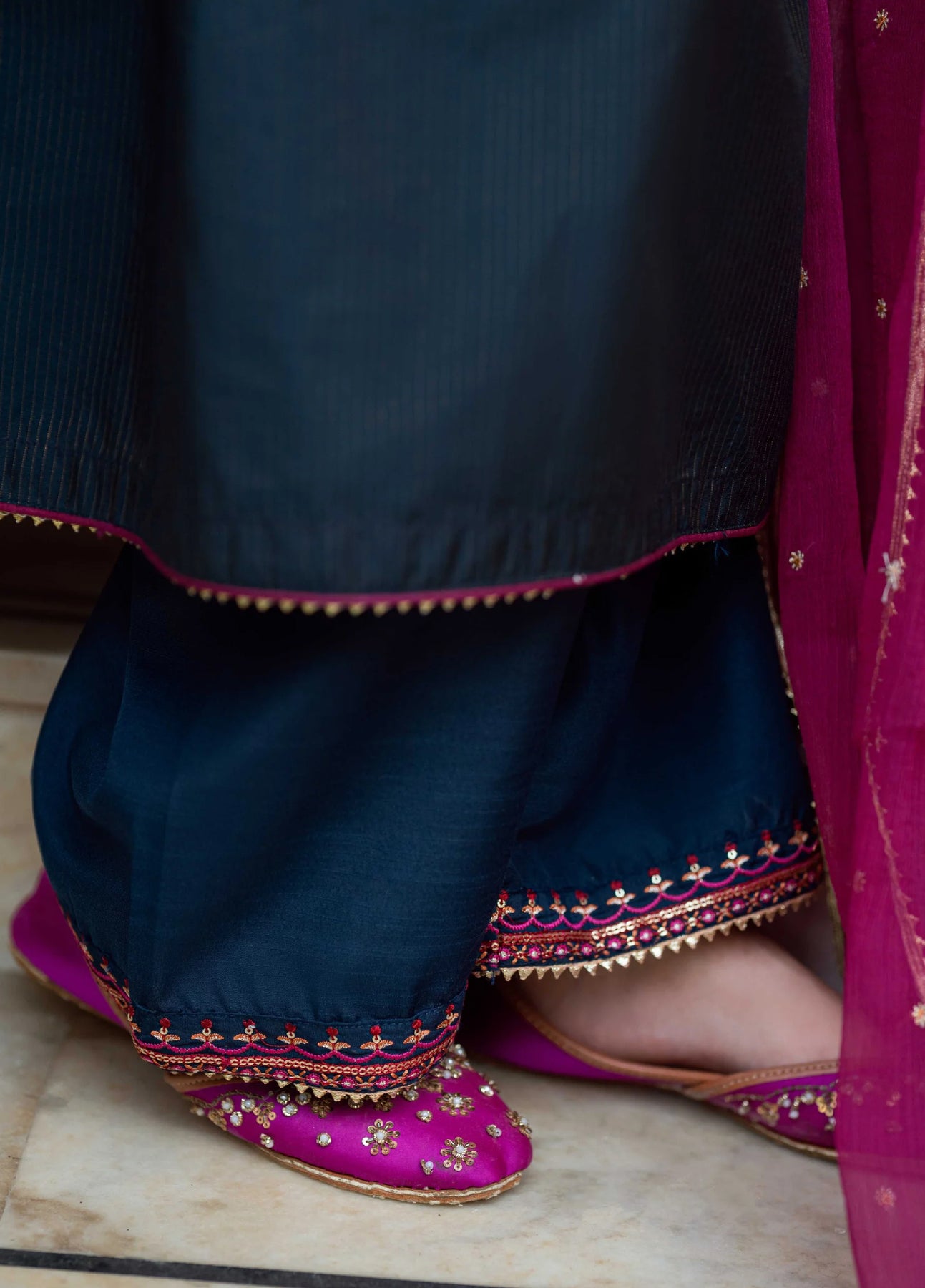 Shirt: Navy blue cotton susi inspired by Balochi style traditional embroidery with sheesha work on body and sleeves, pleat details along with gota finishing. Gathers to give a flare.