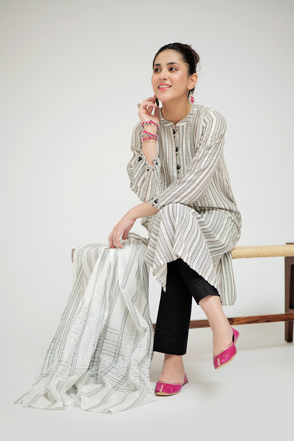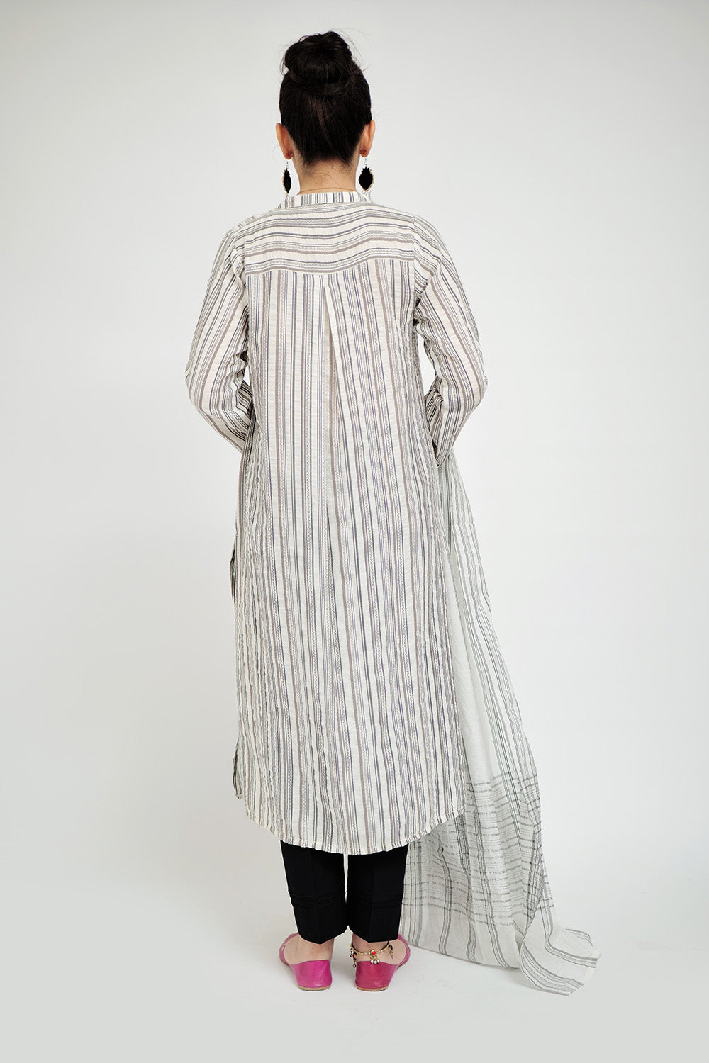 A line shirt with box pleat at the back embellished with crystals and beads paired with straight pants and khaddi net duppatta.