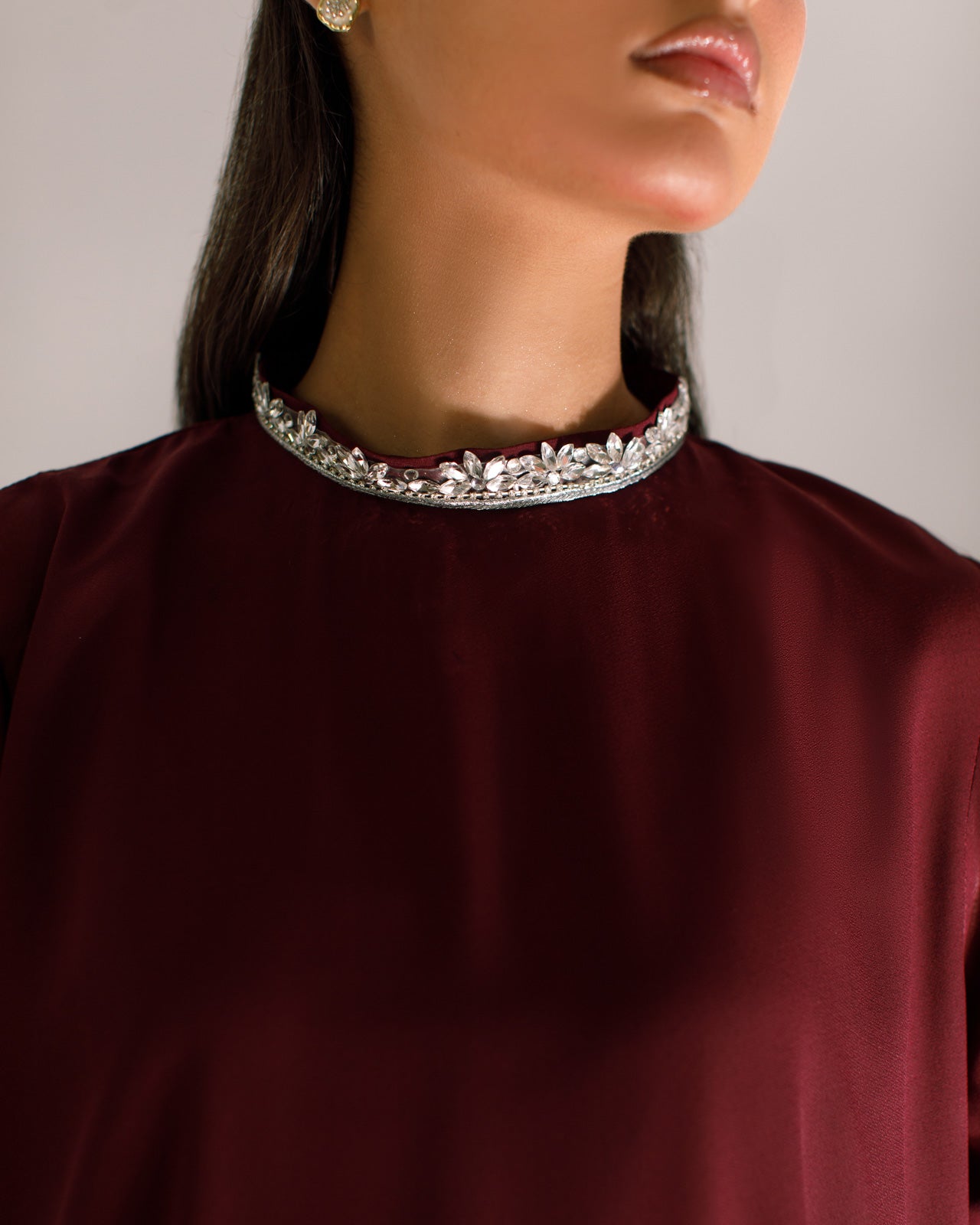 This exquisite two-piece set features a graceful round-neck tunic adorned with delicate crystal lace on the sleeves and neckline, finished with intricate kat dana embellishments along the edges. Paired with stylish bootcut trousers showcasing elegant pleats and button detailing, this ensemble offers a perfect blend of sophistication and comfort