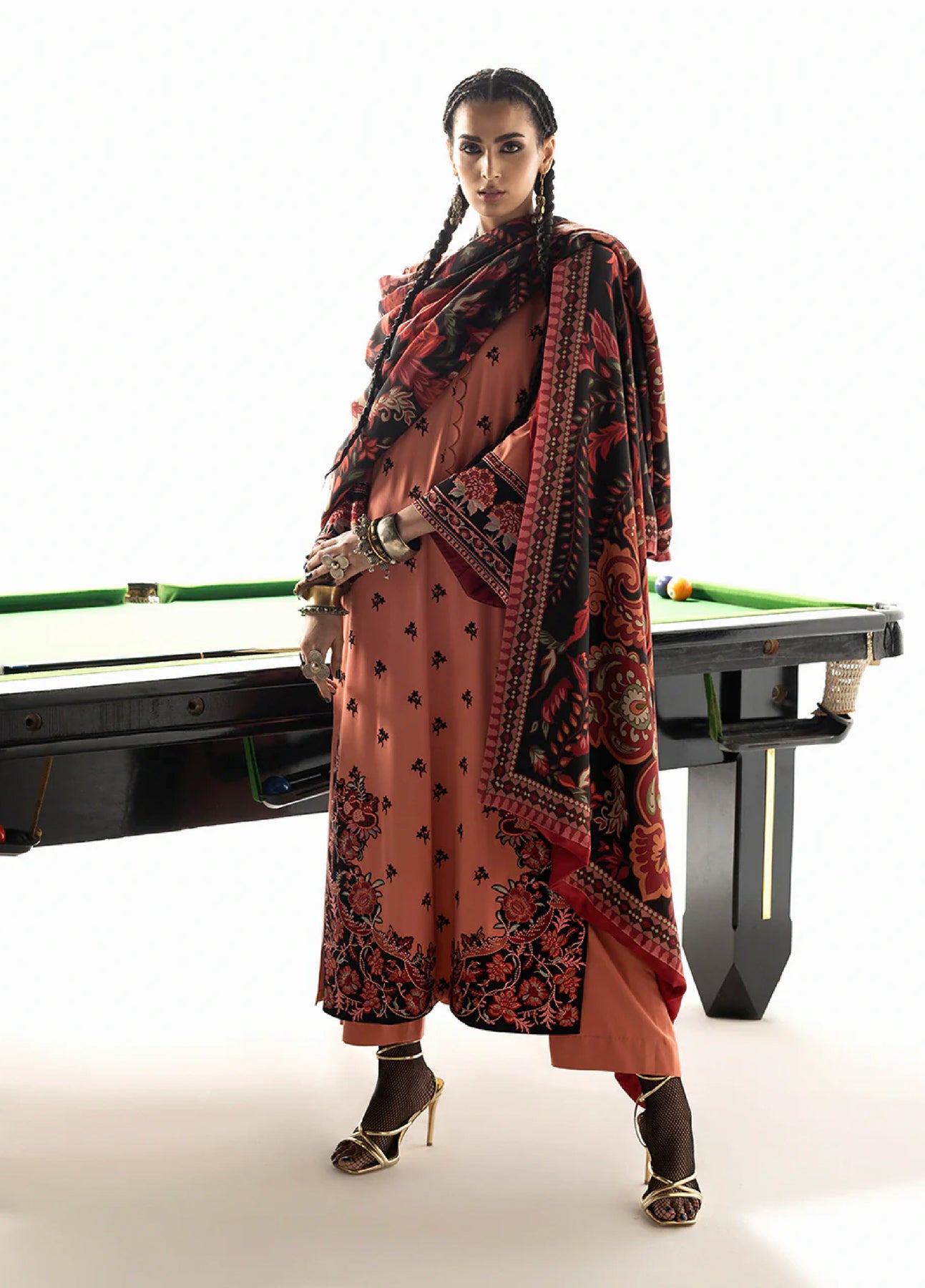 Zuri presents a sophisticated study in contrast and balance, marrying a tranquil base with intensely detailed pattern work. The soft, dusty salmon-pink Marina Twill suit provides a gentle, feminine drape, highlighted by sparse, dark motifs across the body. The real drama unfolds at the borders, where rich, intricate patterns in deep black and vivid maroon frame the hemline and sleeves. The matching Lenzing Ecovero shawl carries this luxurious, dark tapestry, creating a striking visual counterpoint to the lightness of the suit.