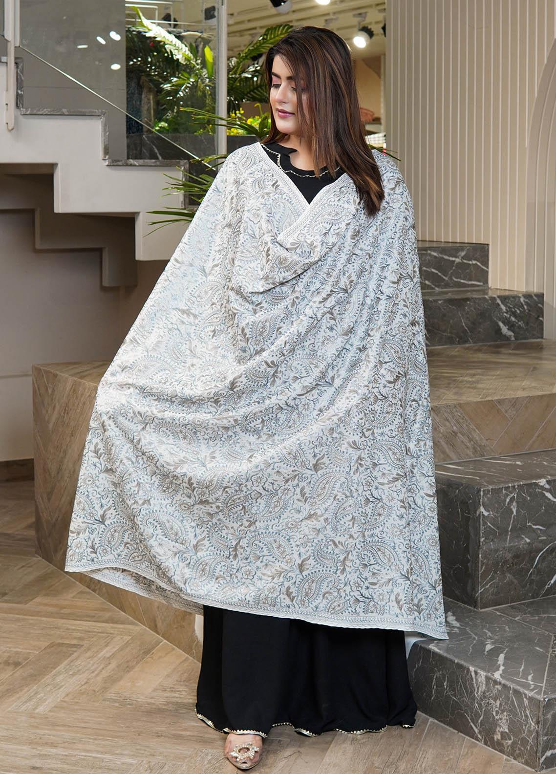 Sanaulla Exclusive Range  Pashmina  Shawls Nalki Flower Boder Jaal KPS-47 White  - Pashmina Shawls