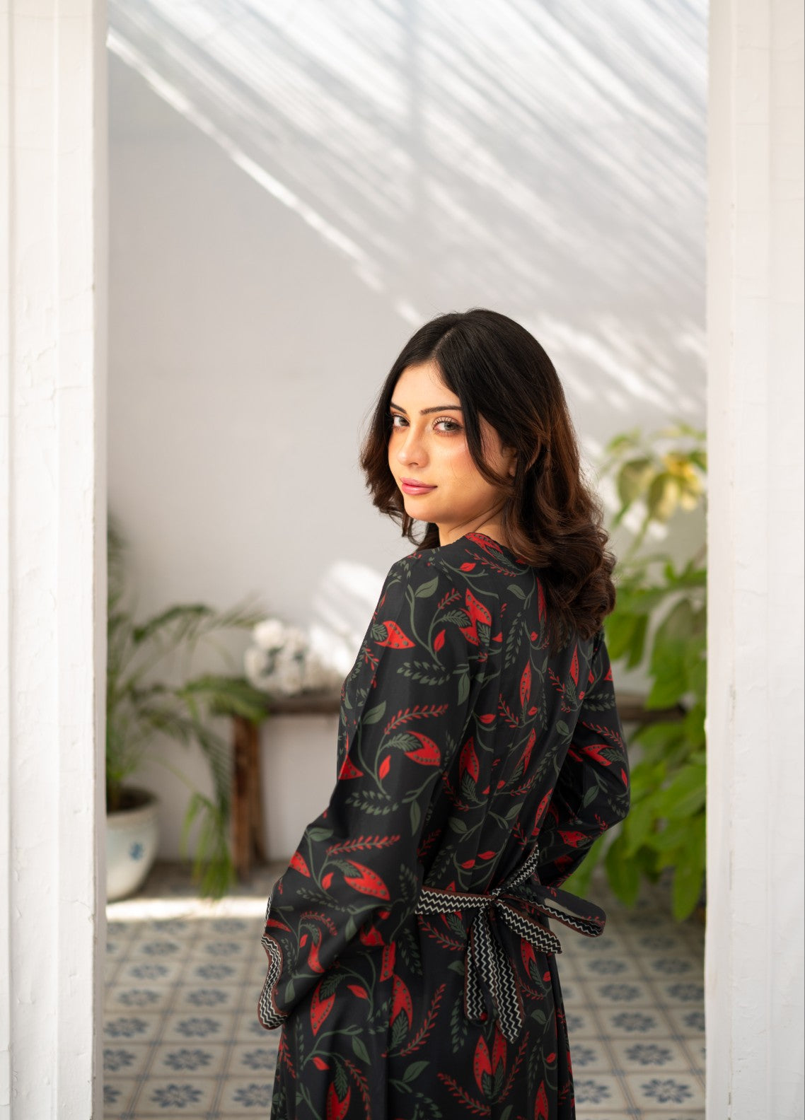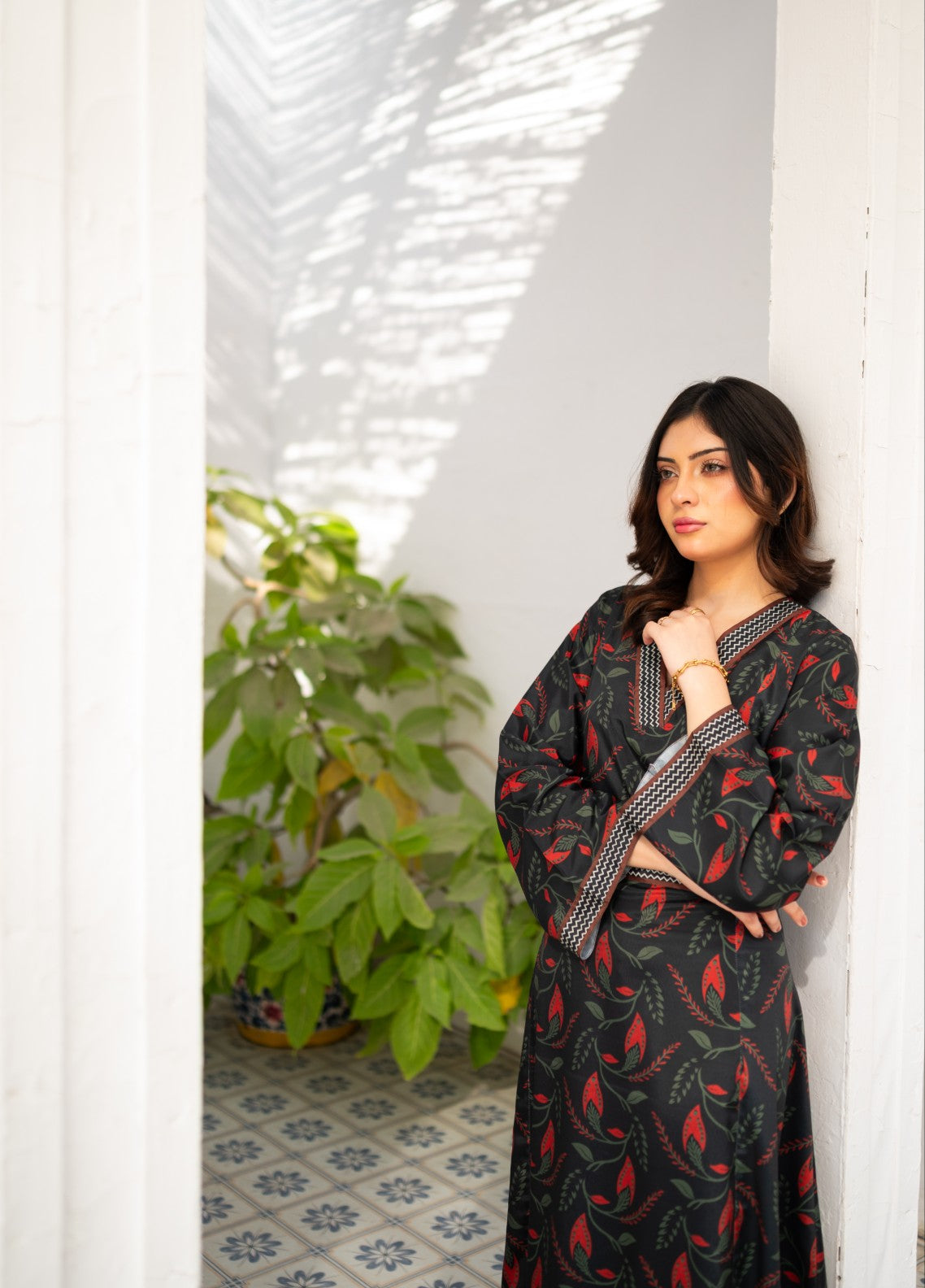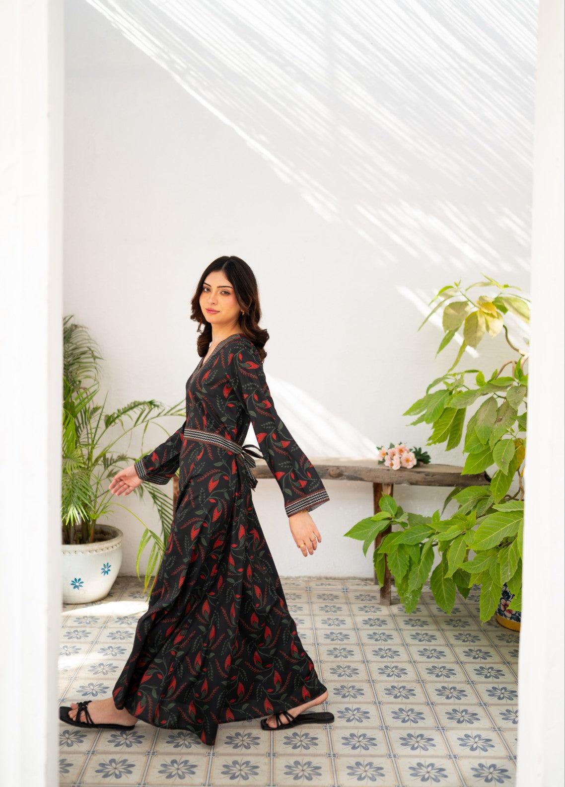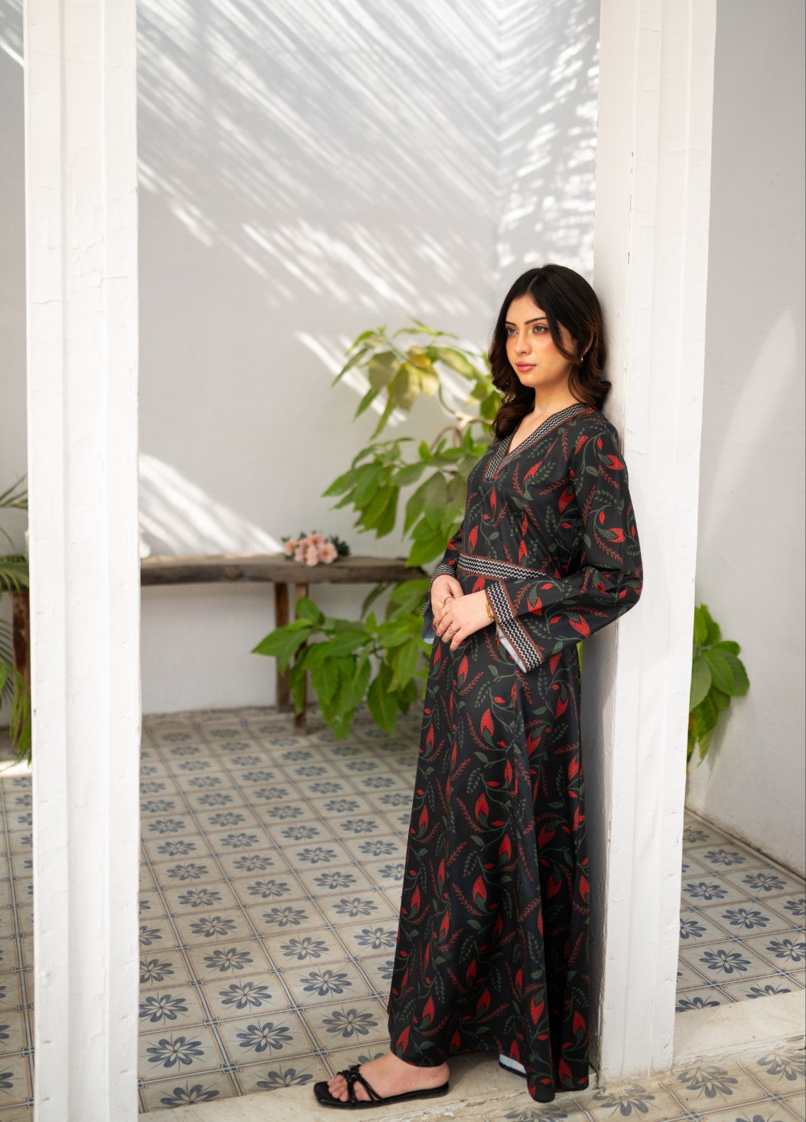 Itโs a V-Neck long dress with flattering cinched waist with borders detailing on neck, body and sleeves.