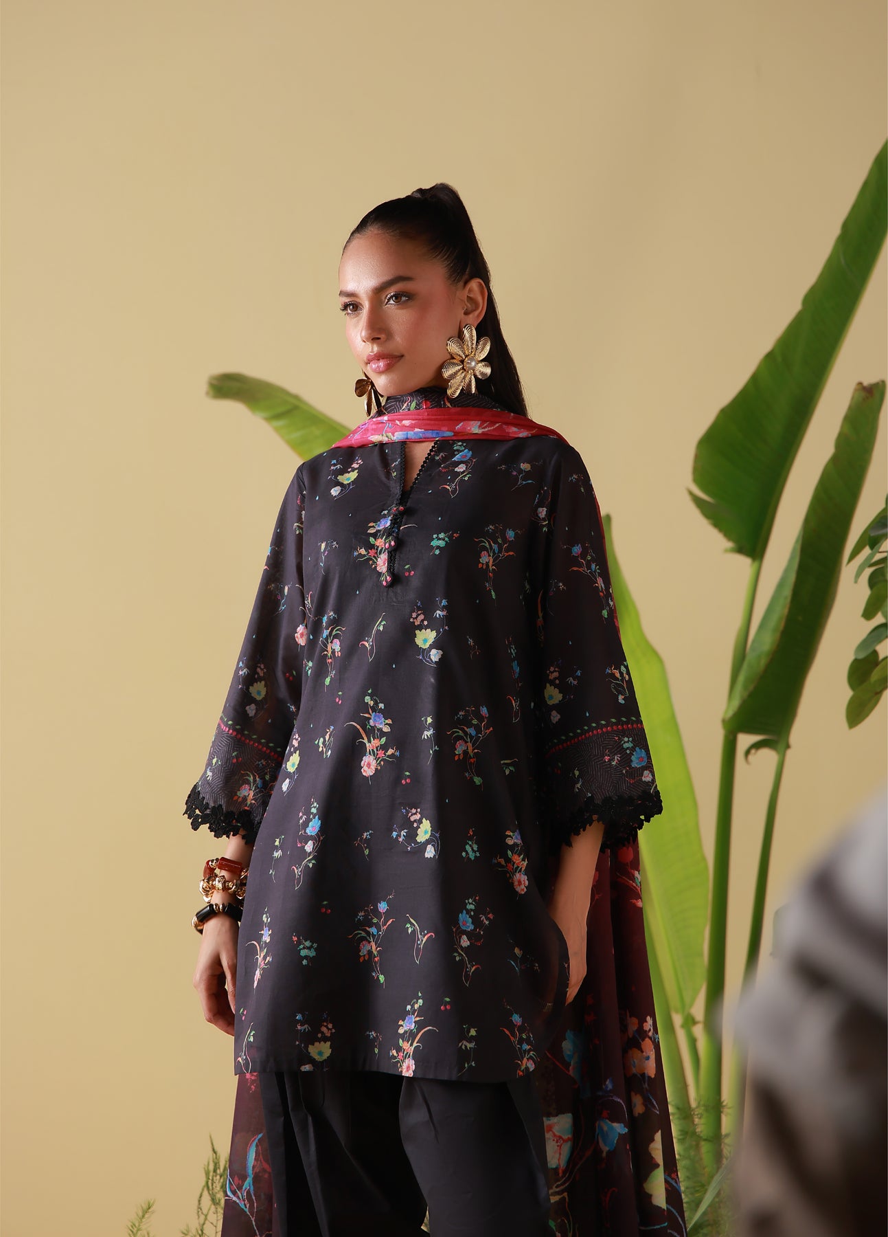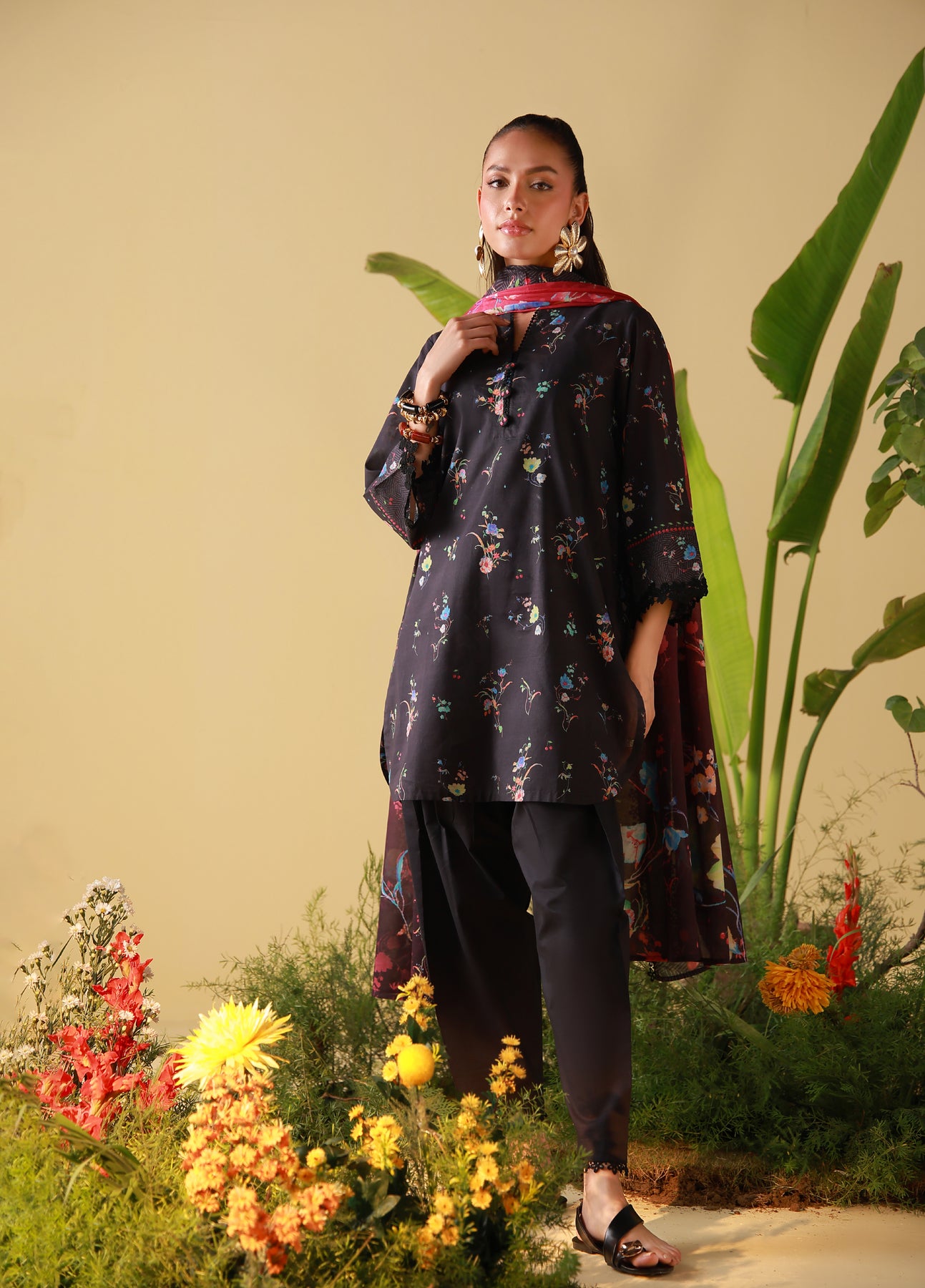Deep black accented with scattered florals in jewel tones for subtle drama. The dupatta adds depth and movement, styled with classic pants. Elegant and effortlessly chic.
