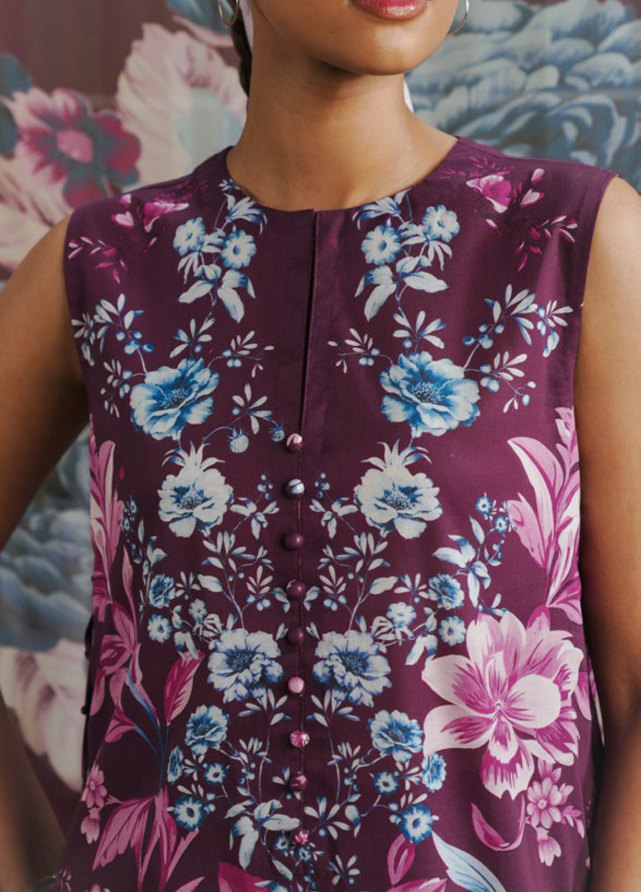 The dupatta features blue and mulberry roses with a purple border on a mulberry base. The shirt is printed with mulberry rose and floral motifs in pink and mulberry tones. The trouser is finished with mulberry scalloped borders on mulberry.